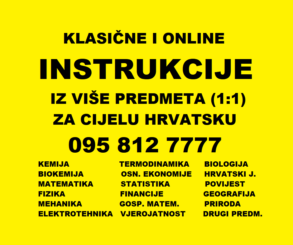 INSTRUKCIJE IZ MATEMATIKE, FIZIKE, KEMIJE, BIOKEMIJE, STATISTIKE, OSNOVA ELEKTROTEHNIKE, MEHANIKE, TERMODINAMIKE, BIOLOGIJE, POVIJESTI, HRVATSKOG, GEOGRAFIJE, VJEROJATNOSTI i drugih predmeta, PODUKE, REPETICIJE, LEKCIJE.