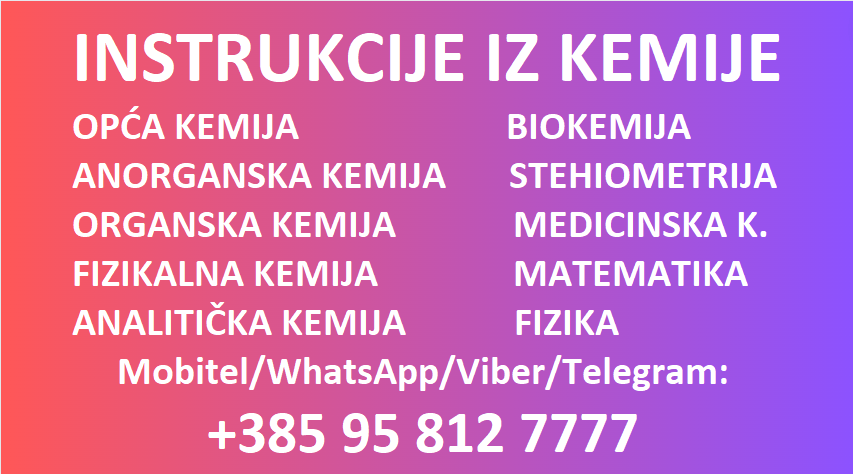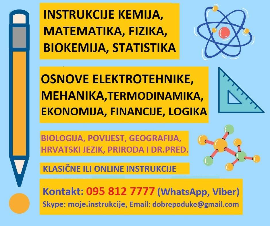 Online instrukcije: Matematika, Fizika, Kemija, Biokemija, Organska kemija, Fizikalna kemija, Analitička kemija, Statistika, Mehanika, Osnove elektrotehnike, Biologija, Povijest, Hrvatski jezik, Termodinamika, Geografija...