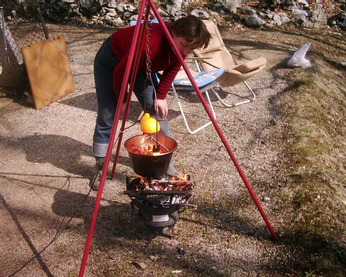 Nov je, na svom lovačkom stalku, sa miješalicom na 220 V koja stalno lagano miješa gulaš, paprikaš, variva, ajvar, đem a može se prebaciti na druge veće posude ( jelo kuhano na otvorenom dobiva posebno fin okus ) - 100 Eura.