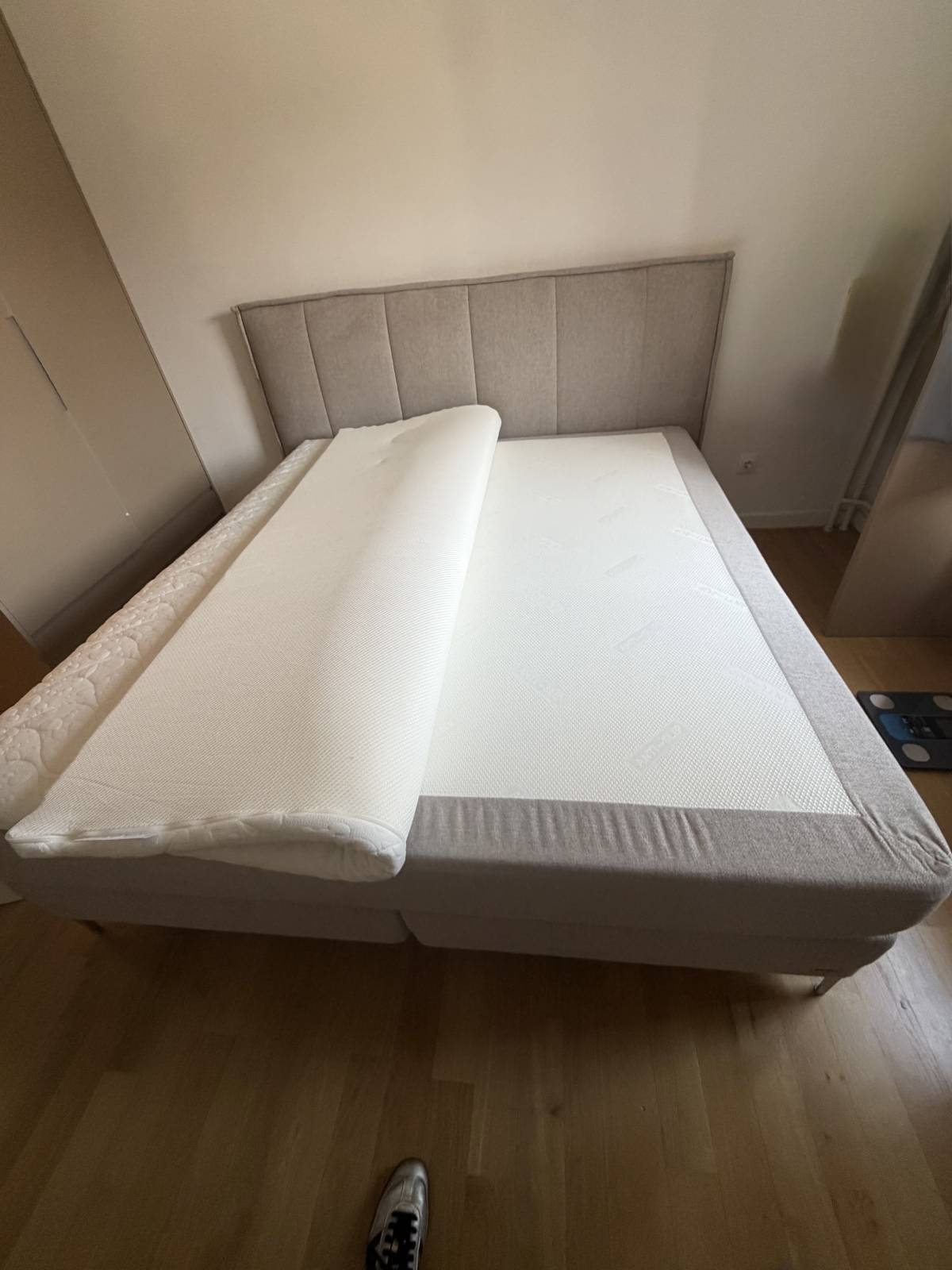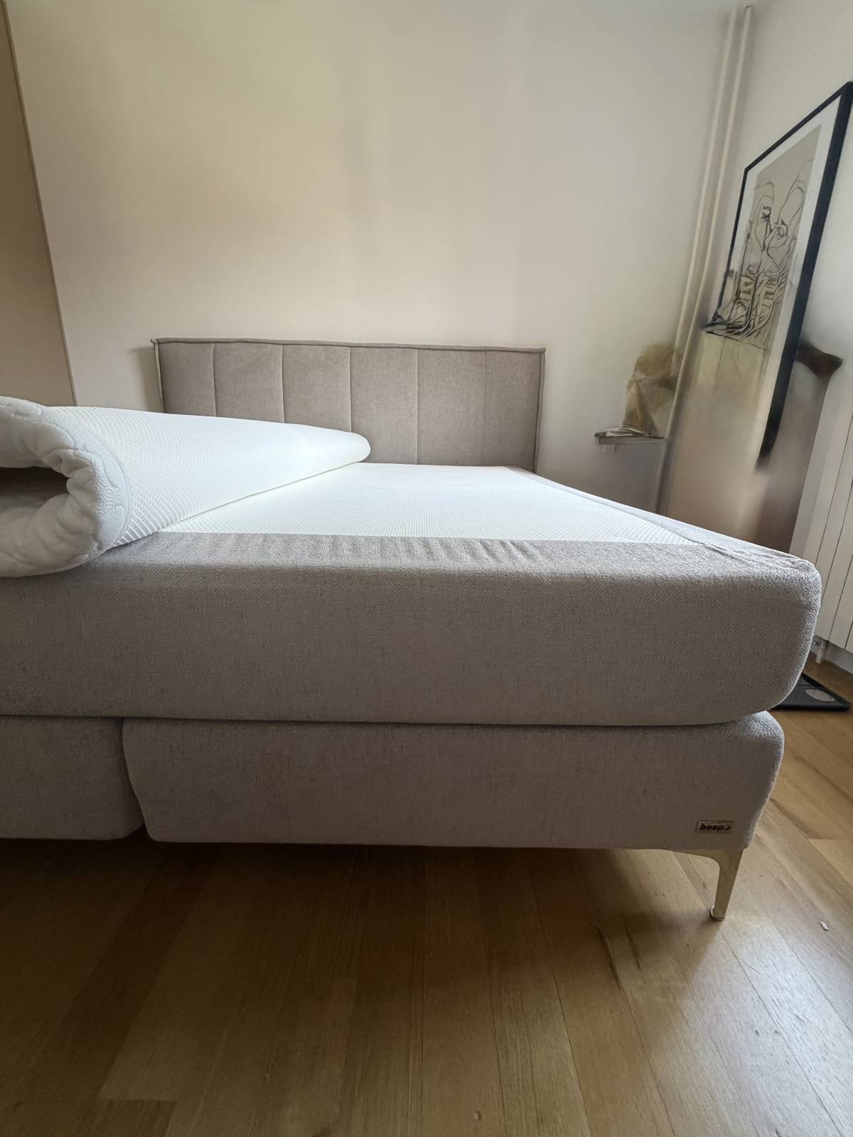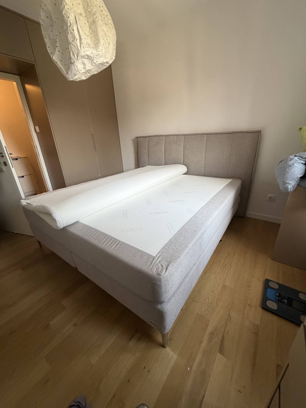 Prodajem boxspring krevet Atena (Hespo) 200x180,materijal Carter, boja kasmira (sivo bež), kupljen 10/2020, a nadmarac novi 10/2024 - Sole New.Baza kreveta ima ugrađenu džepićastu opružnu jezgru koja pruža čvrst i ravnomjeran oslonac madracu. Madrac je također s džepićastom jezgrom, a na njemu se nalazi i nadmadrac, što zajedno čini trodijelnu konstrukciju tipičnu za boxspring sustav. Krevet je širine 180 cm izvedene u dva dijela radi lakšeg unosa i rukovanja. cijena je 750eur. lokacija za preuzimanje Zagreb, Jarun. Krevet je rabljen. Izvrsno stanje, nema ostecenja. Redovno odrzavan dubinskim ciscenjem.