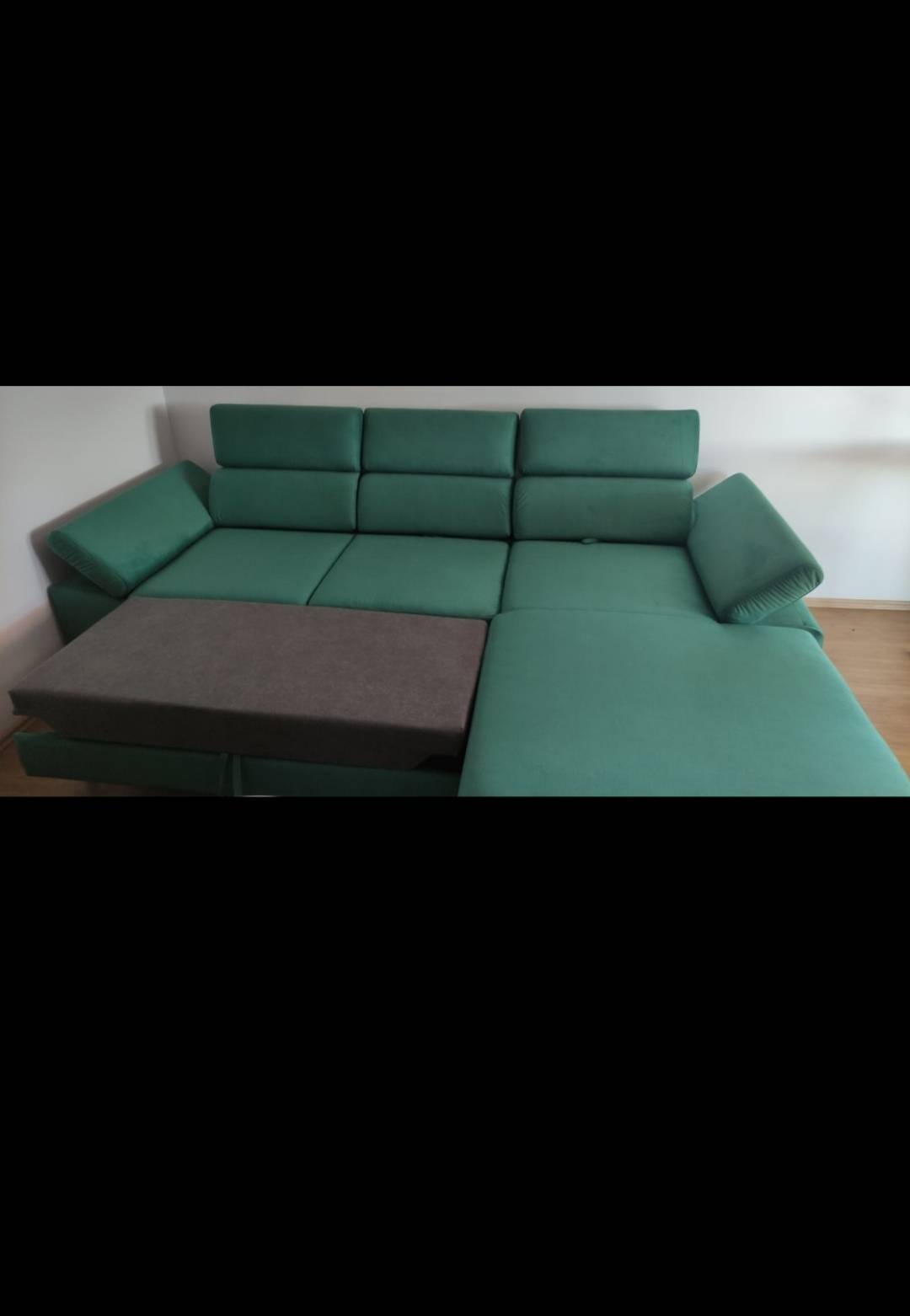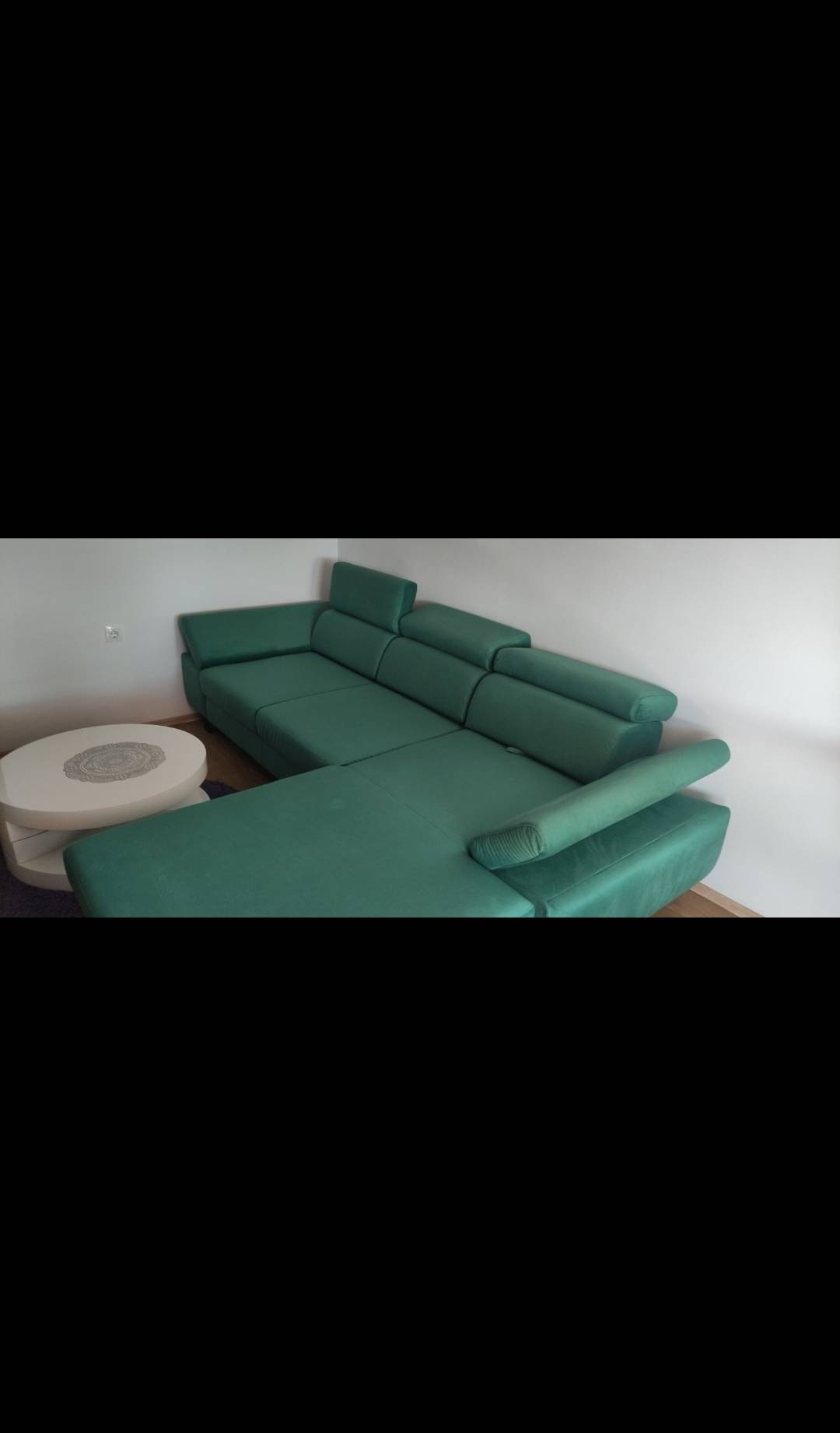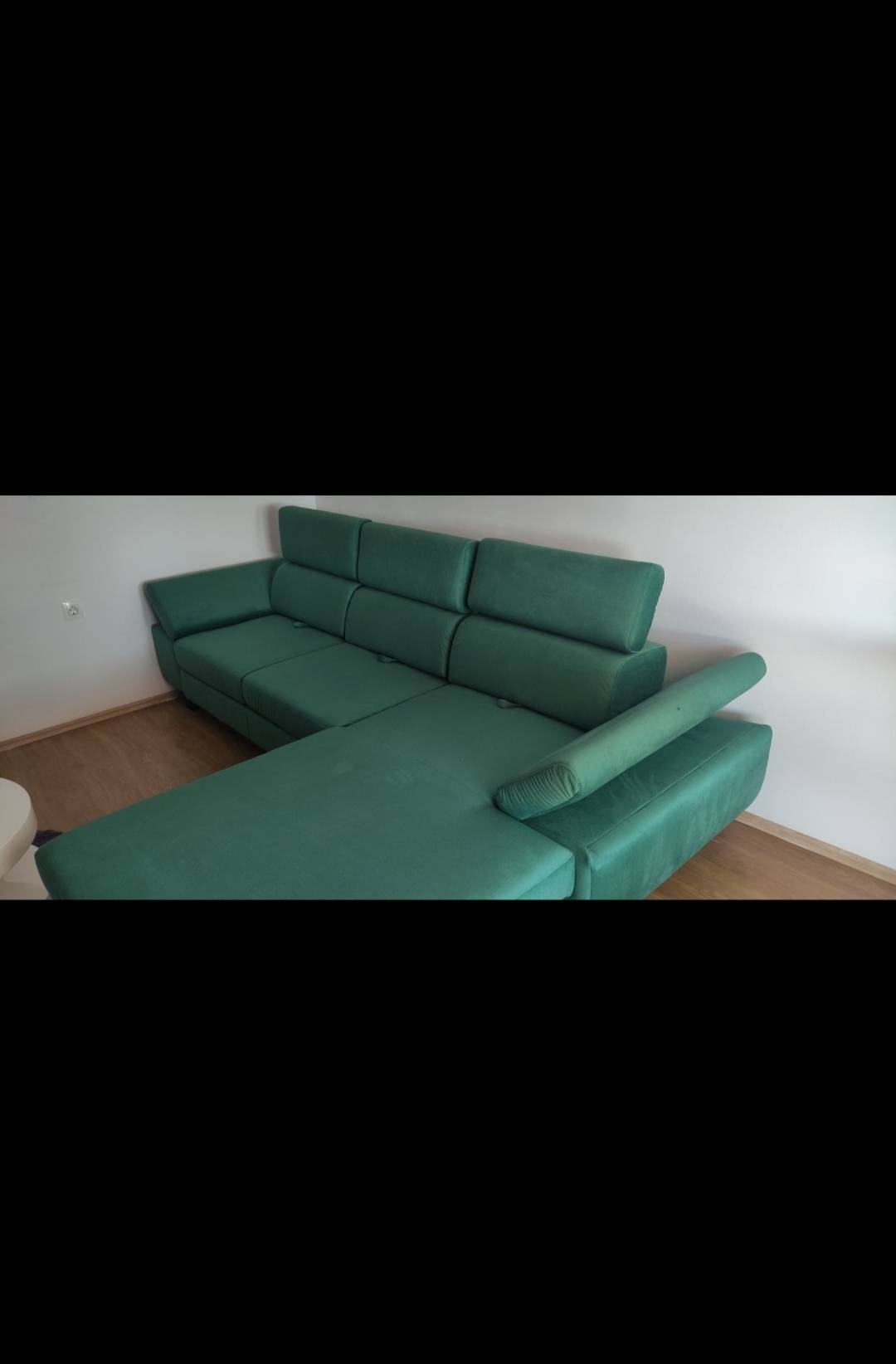 Prodaje se kutna garnitura desni kut, nova samo otpakirana i složena da se vidi kako stoji u prostoru.Ne paše nam kut i to je razlog prodaje.Kutna ima pomične glavonaslone 3 komada,pomične naslone za ruke sa strane,te se sva tri dijela naslona za leđa mogu pomicati prema naprijed dok se sjedi ili ih pomaknuti skroz iza dok se odmara na garnituri.Garnitura također ima izvlačni ležaj.Dimenzije su: