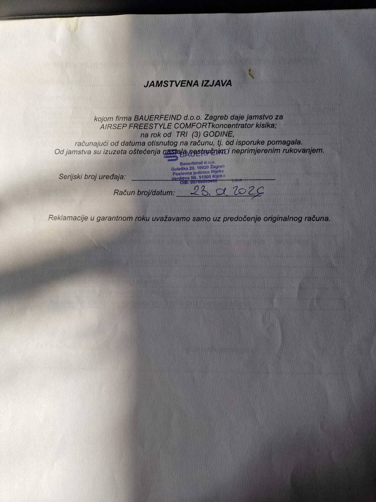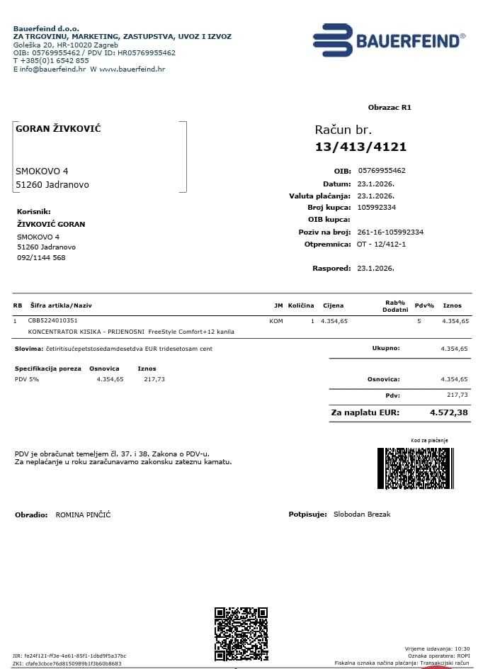 Uređaj je kupljen po preporuci pulmologa od tvrtke Bauerfeind d.o.o. Zagreb, ispravan je, korišten je nažalost samo dva tjedna, a uz isti dobivate dodatke i torbicu sa punjačem za vozilo te račun Bauerfeind d.o.o. Zagreb izdan 23.01 2026. uz jamstvo na tri godine.