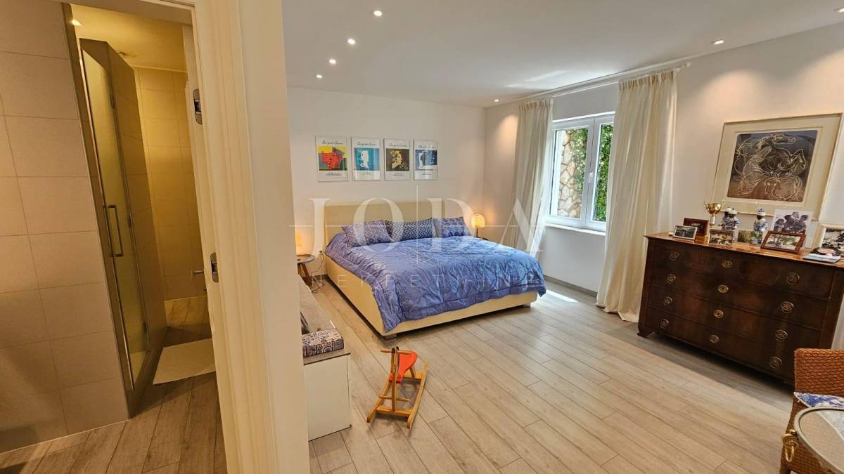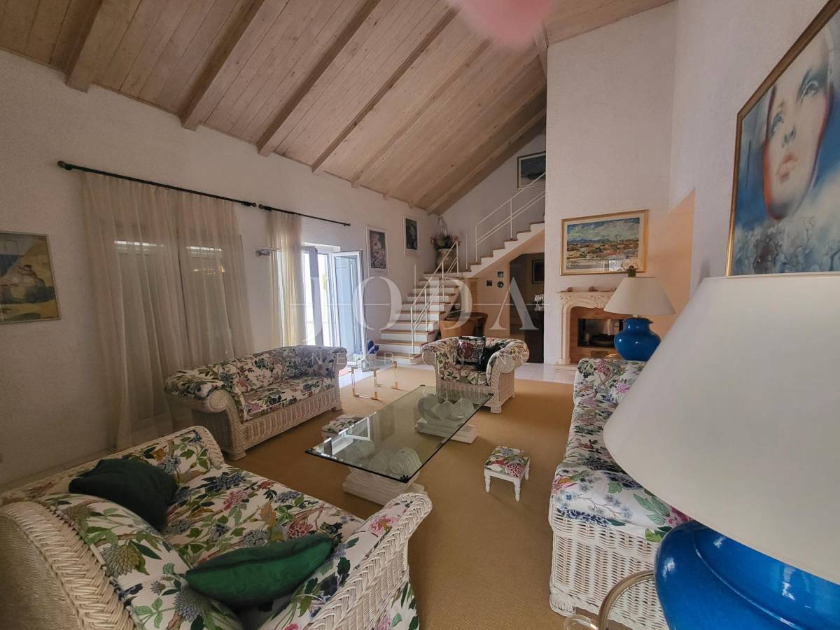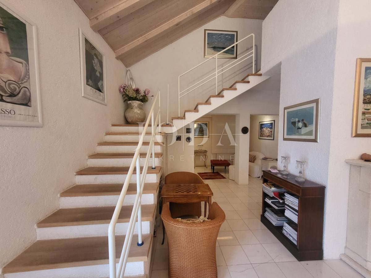 Prva kuća sastoji se od dva kata. Na prvom katu nalaze se 3 spavaće sobe, 2 kupaonice, kuhinje, blagavaonice, dnevnog boravka. Unutarnjim stepenicama dolazimo na prvi kat koji se sastoji od master spavaće sobe te kupaone i predivne terase sa otvorenim pogledom na more. Velika terasa s otvorenim pogledom na more predstavlja oazu mira i savršeno mjesto za opuštanje. Ova prostrana master spavaća soba na prvom katu nudi privatnost i luksuz.