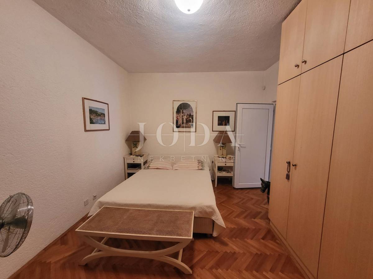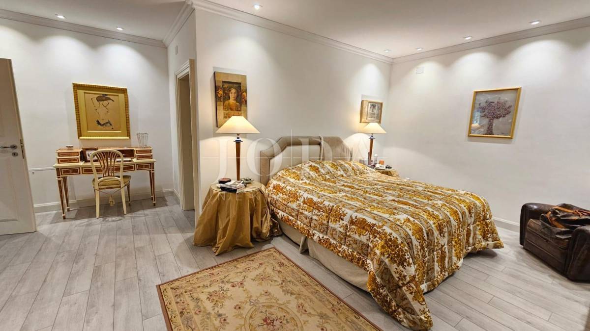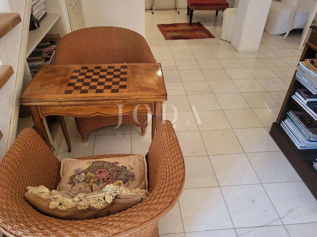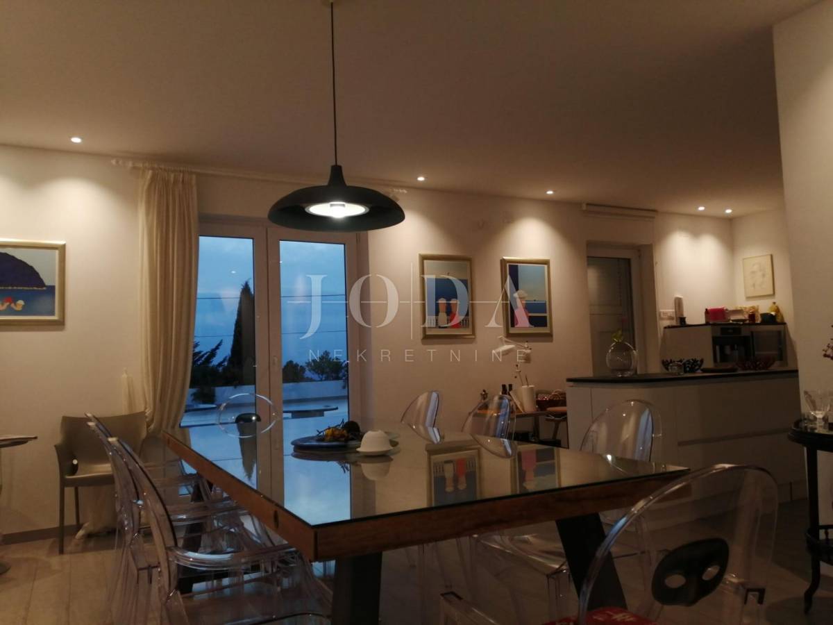 Prva kuća sastoji se od dva kata. Na prvom katu nalaze se 3 spavaće sobe, 2 kupaonice, kuhinje, blagavaonice, dnevnog boravka. Unutarnjim stepenicama dolazimo na prvi kat koji se sastoji od master spavaće sobe te kupaone i predivne terase sa otvorenim pogledom na more. Velika terasa s otvorenim pogledom na more predstavlja oazu mira i savršeno mjesto za opuštanje. Ova prostrana master spavaća soba na prvom katu nudi privatnost i luksuz.