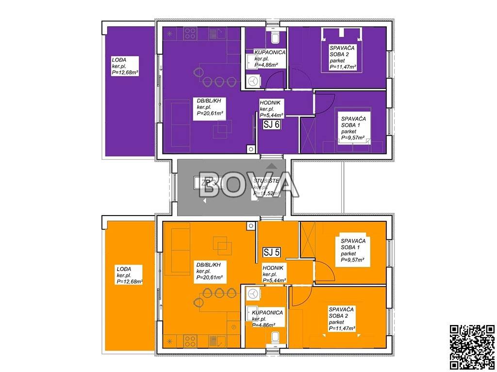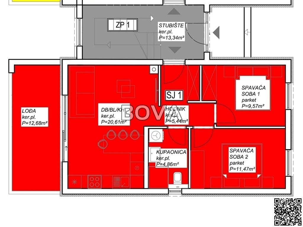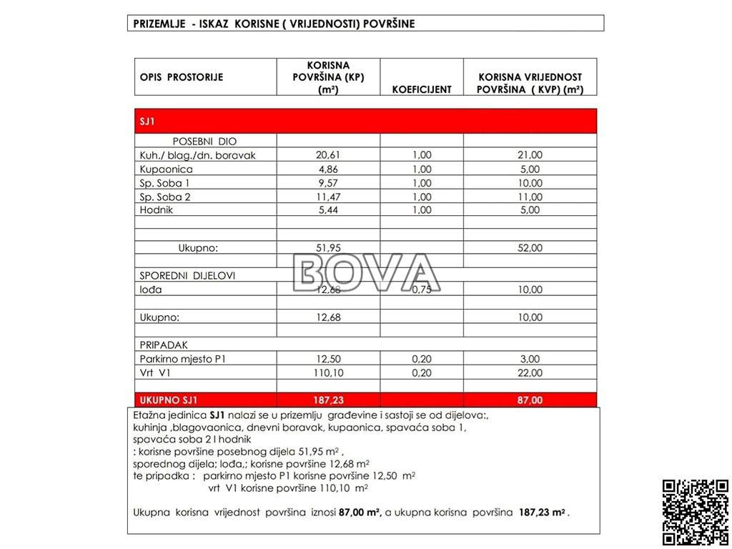 apartmanu pripada i parkirno mjesto oznake P1 površine 12,50 m2, vrt oznake V1 površine 110,10 m2, što čini ukupnu korisnu vrijednost površina od 87,00m2;