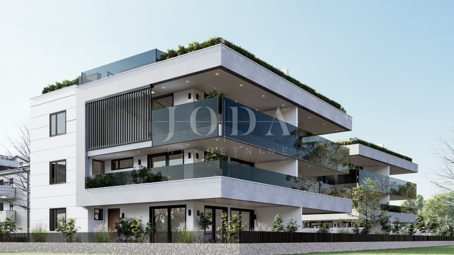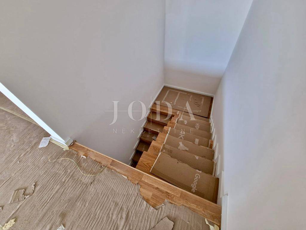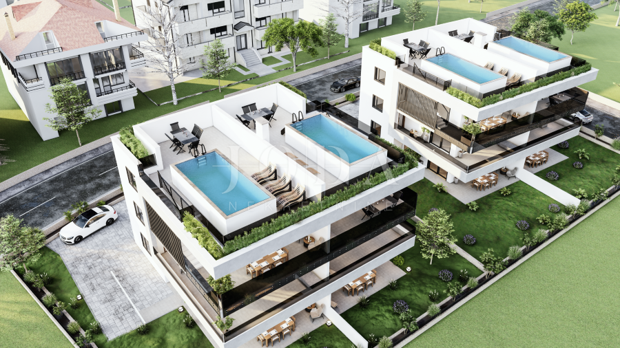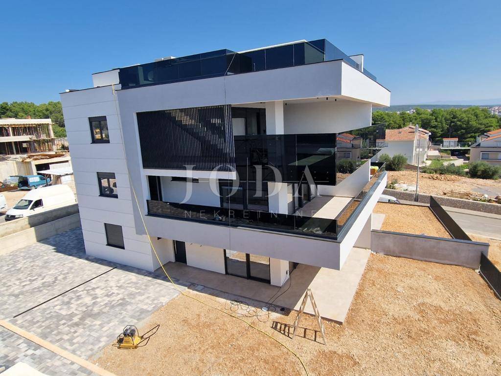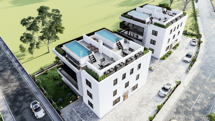 Apartman je podijeljen na dva kata i površine je 160 m2. Nalazi se na prvom i drugom katu. Na prvom katu se nalaze hodnik, tri spavaće sobe s izlazom na balkon s kojeg se pruža pogled na more te dvije kupaonice. Na drugom katu se nalaze prostrani dnevni boravak s izlazom na terasu, kuhinja i blagavaonica te toalet. Prvi i drugi kat su spojeni unutarnji stepeništem, a vanjskim stepeništem se dolazi na krovnu terasu površine cca 60 m2 gdje se nalazi bazen i sunčalište. Zgrada je izgrađena s najkvalitetnijim materijalima i apartmani su opremljeni klima uređajima, dizalicama topline, ALU stolarijom i prvoklasnim parketom i keramikom. Apartmanu pripadaju dva parkirna mjesto. Nekretnina se nalazi na izvanrednoj lokaciji udaljena cca 600 metara od mora i plaže. Useljenje je predviđeno do kraja 2023. godine.