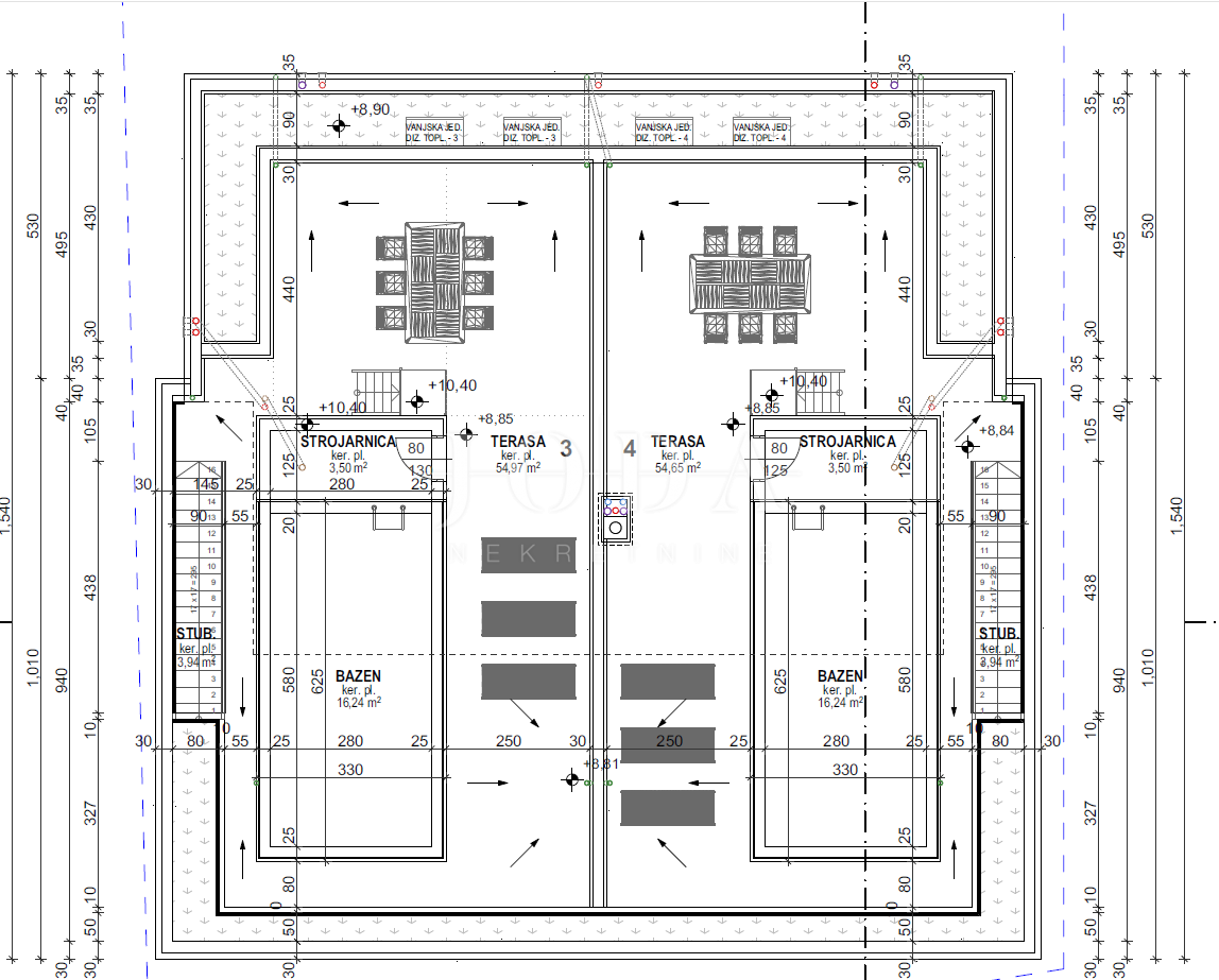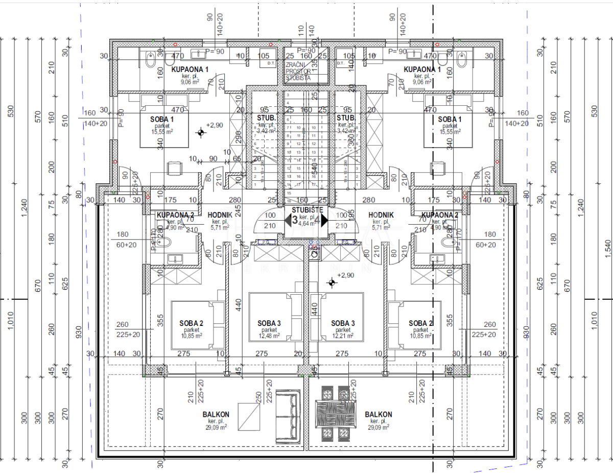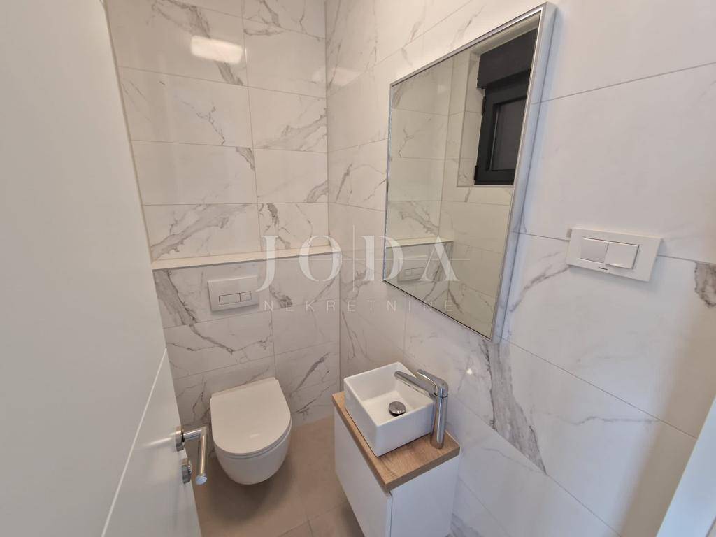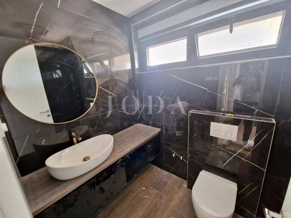 Apartman je podijeljen na dva kata i površine je 160 m2. Nalazi se na prvom i drugom katu. Na prvom katu se nalaze hodnik, tri spavaće sobe s izlazom na balkon s kojeg se pruža pogled na more te dvije kupaonice. Na drugom katu se nalaze prostrani dnevni boravak s izlazom na terasu, kuhinja i blagavaonica te toalet. Prvi i drugi kat su spojeni unutarnji stepeništem, a vanjskim stepeništem se dolazi na krovnu terasu površine cca 60 m2 gdje se nalazi bazen i sunčalište. Zgrada je izgrađena s najkvalitetnijim materijalima i apartmani su opremljeni klima uređajima, dizalicama topline, ALU stolarijom i prvoklasnim parketom i keramikom. Apartmanu pripadaju dva parkirna mjesto. Nekretnina se nalazi na izvanrednoj lokaciji udaljena cca 600 metara od mora i plaže. Useljenje je predviđeno do kraja 2023. godine.