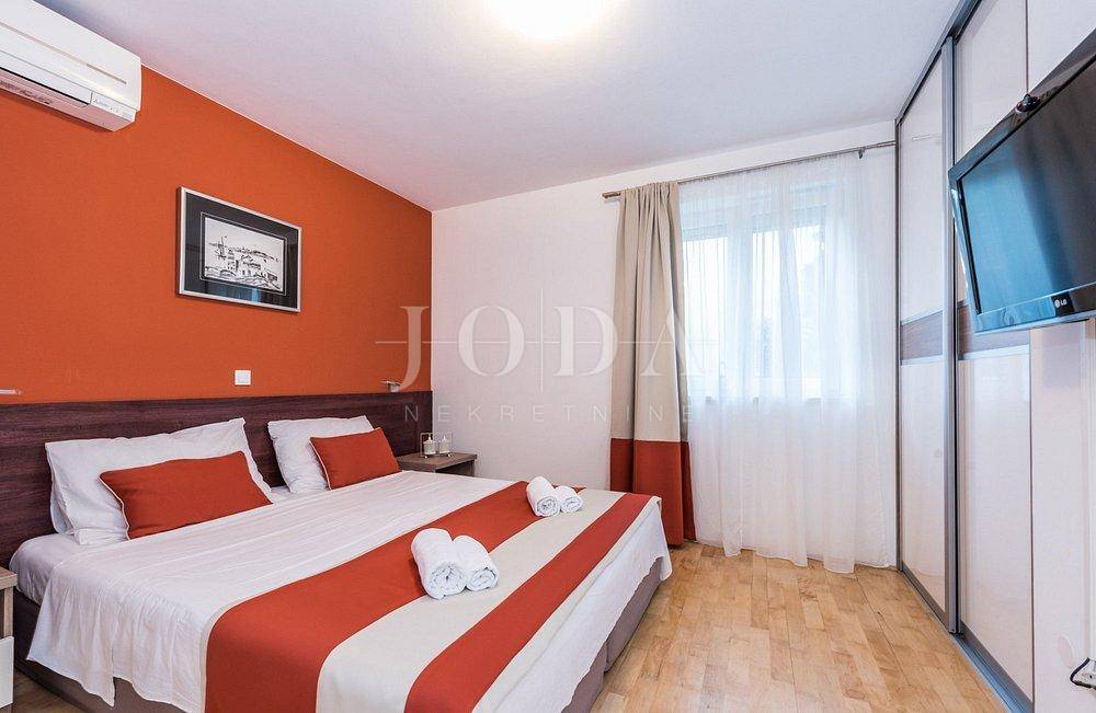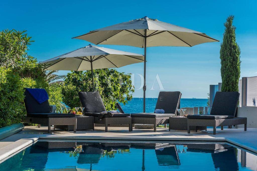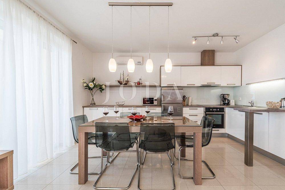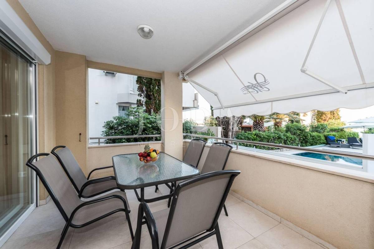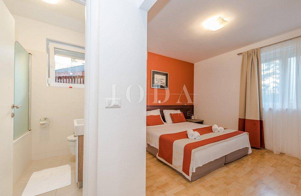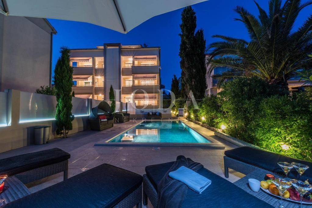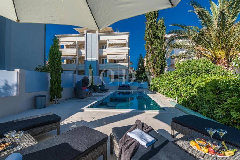 Apartman sa vlastitim prilazom prema plaži,unutar koje okućnice je smješten grijani bazen,sjenica za 10 osoba sa grillom.
