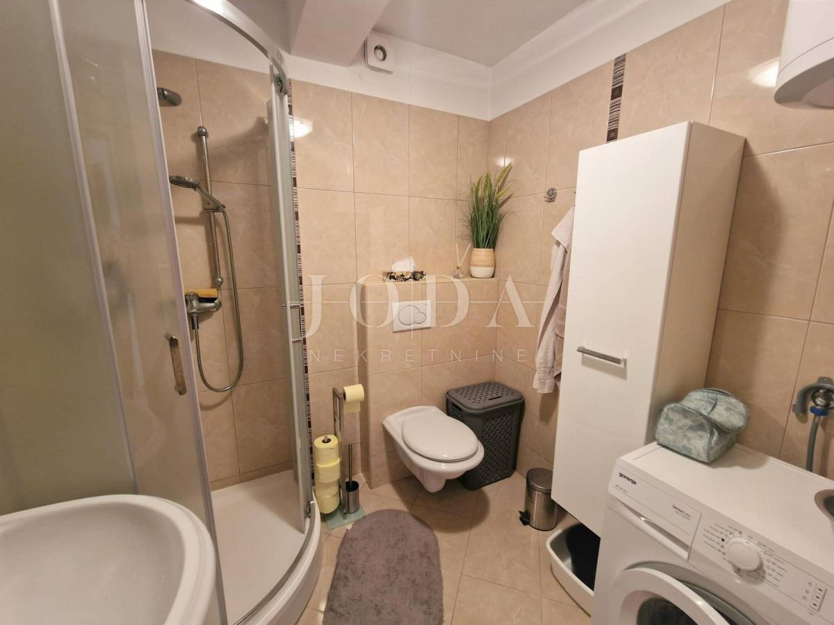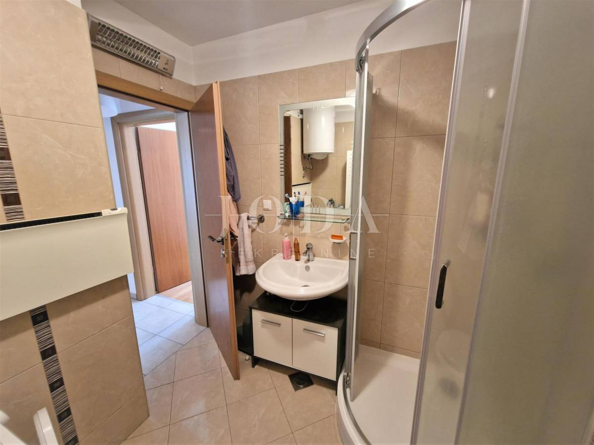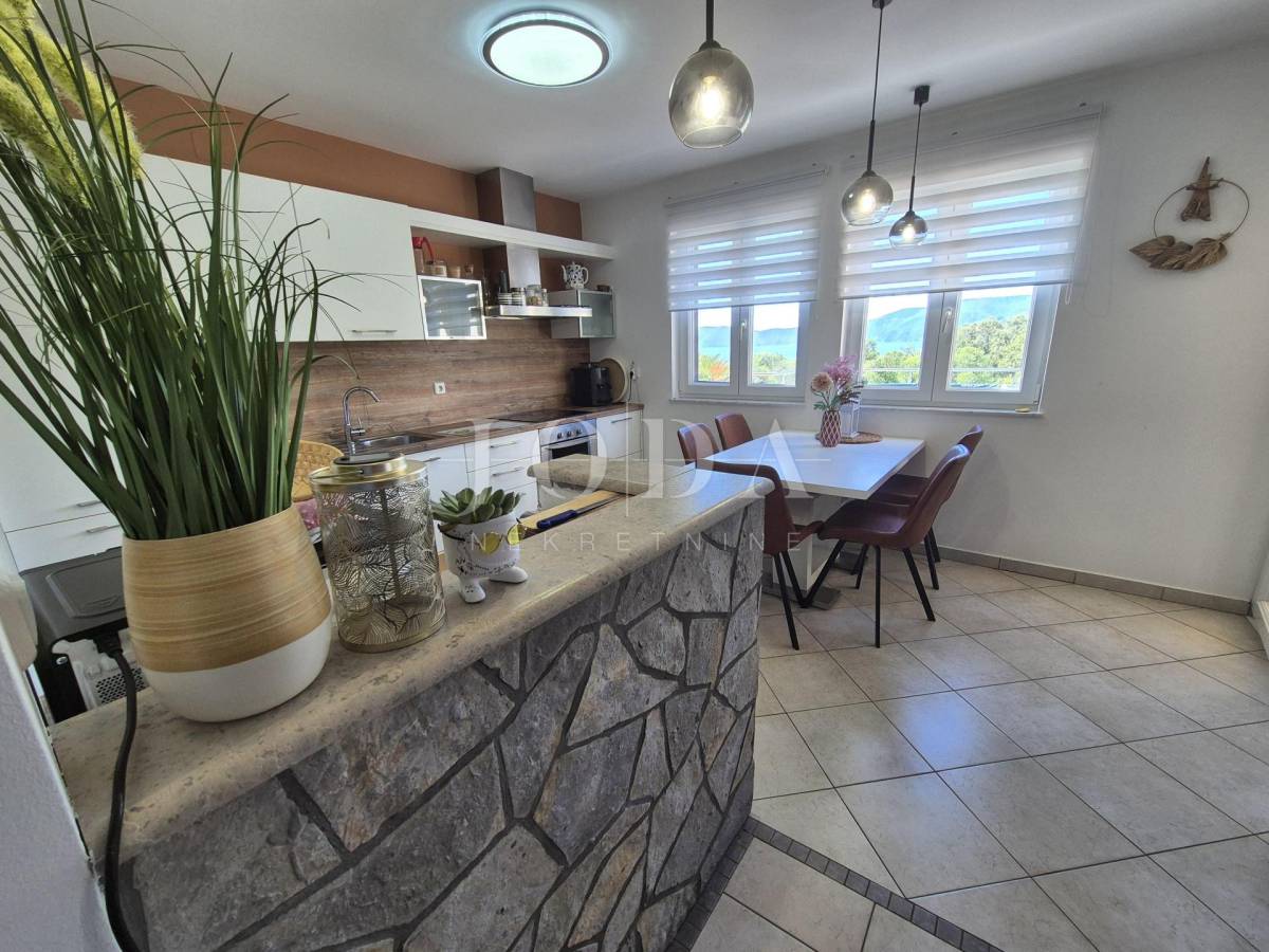 Krk, šira okolica, prodaje se apartman stambene površine 72,57 m2 smješten u prizemlju manje stambene zgrade. Sastoji se od dnevnog boravka, kuhinje s blagovaonicom, spremišta, kupaonice, dvije spavaće sobe i terase površine 40 m2 s pogledom na more. Apartman je klimatiziran s mogućnošću grijanja na pelete, namješten je i odmah useljiv. Pripada mu okućnica površine 200 m2 i spremište koje se nalazi pokraj parkirnog prostora. Mirna lokacija 600 metara od mora.