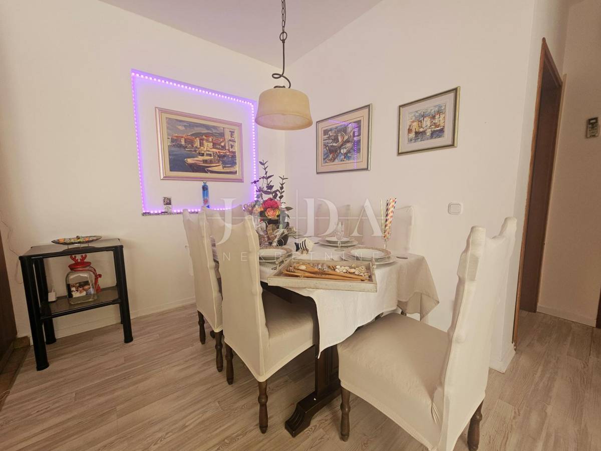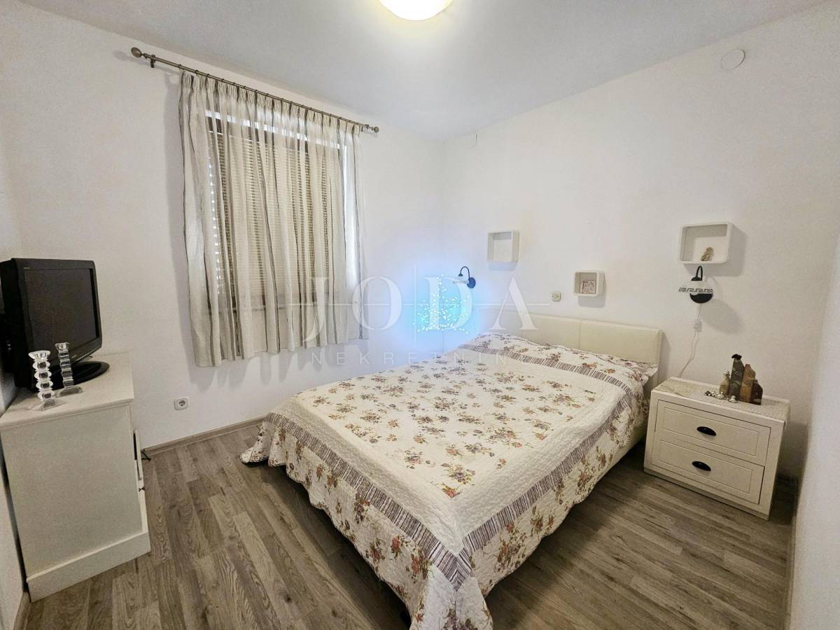 Apartman u prizemlju površine 71,40 m2 koji se sastoji od dvije spavaće sobe, dnevnog boravka s kuhinjom i blagovaonom, kupaone i terase. Stan ima lijepo uređenu okućnicu, jedno parkirno mjesto i odvojeno spremište.
