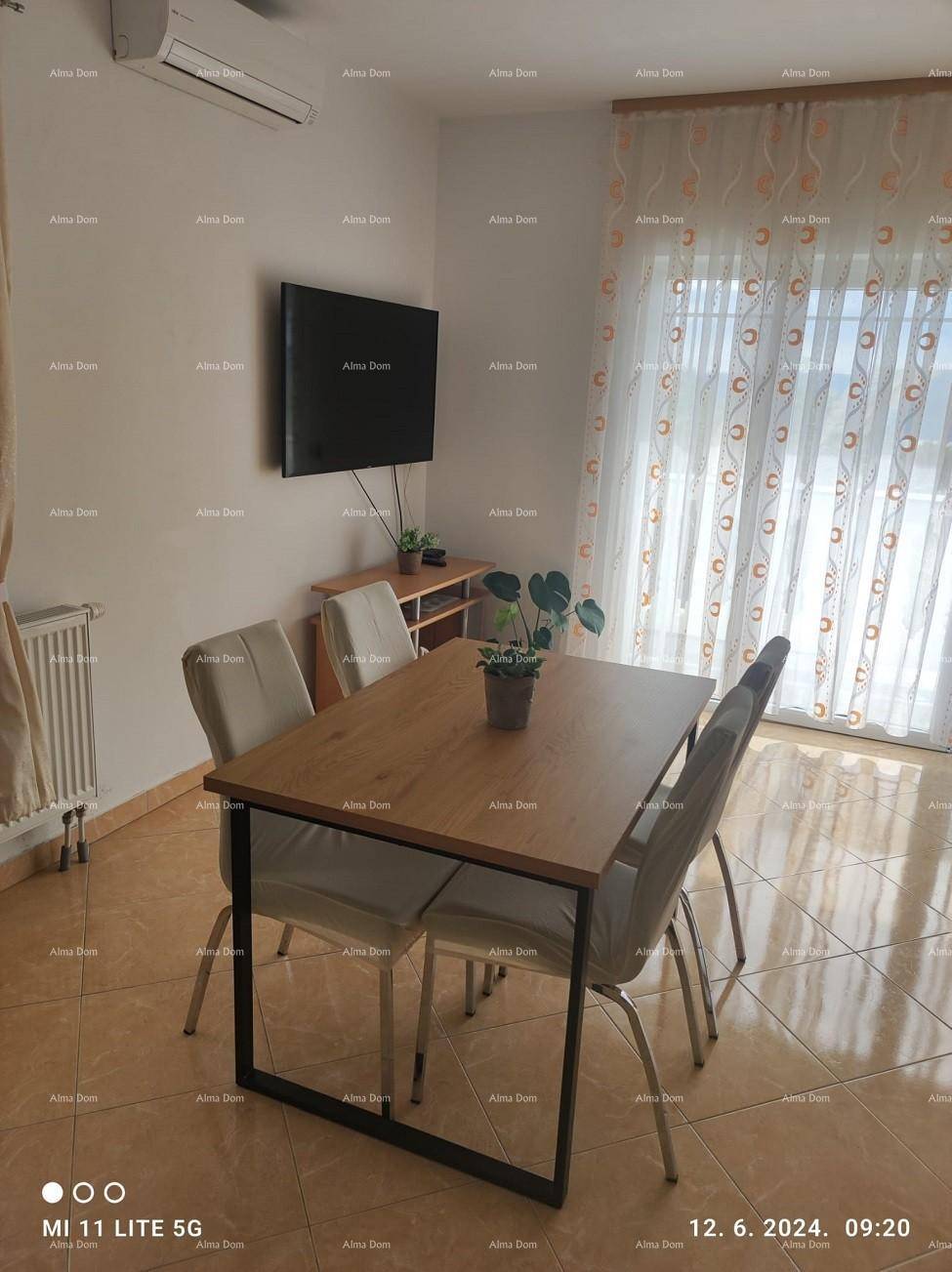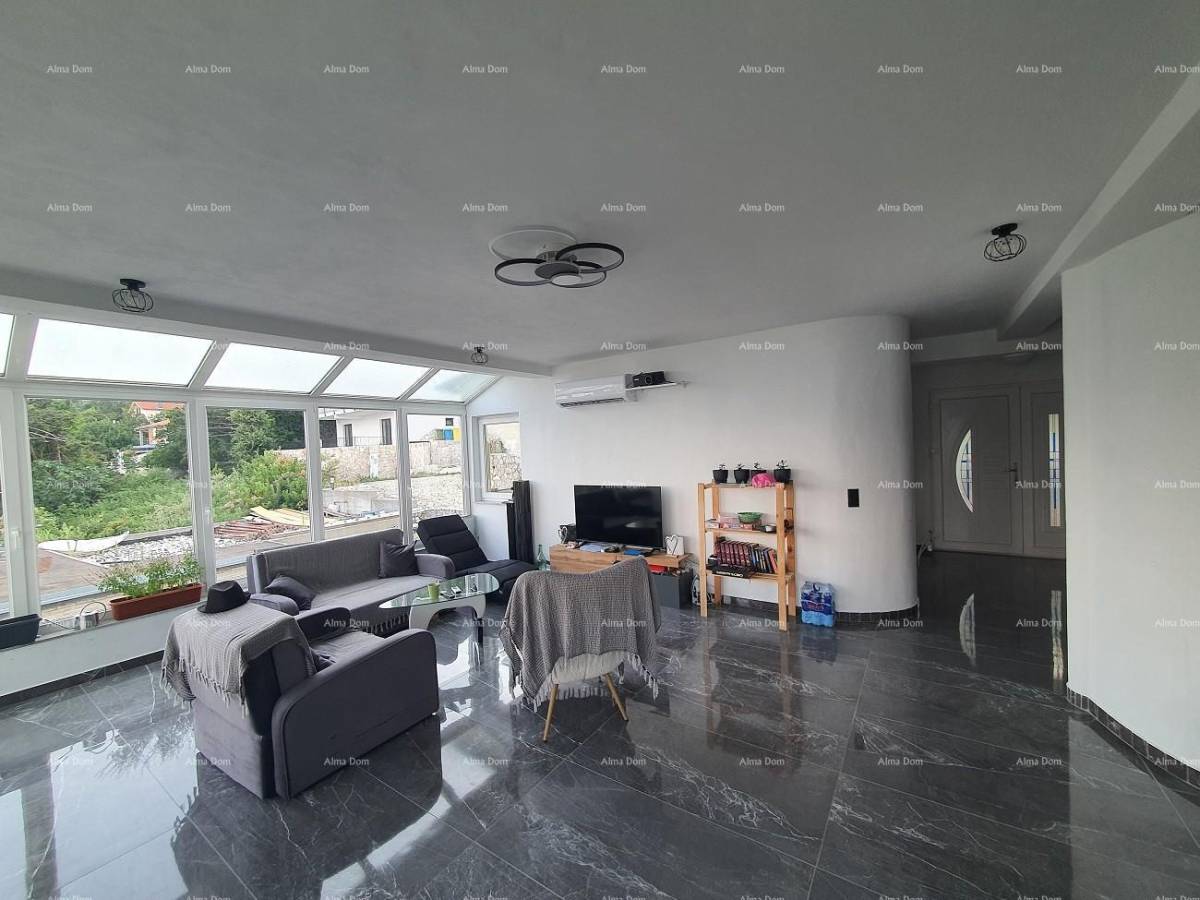 Dolje u stanu se nalazi ogroman dnevni boravak i kuhinja s izlazom na terasu s prekrasnim pogledom na more, jedna spavaca soba, zaseban WC i posebno kupatilo, a na gornjem katu je spavaća soba s kupatilom.