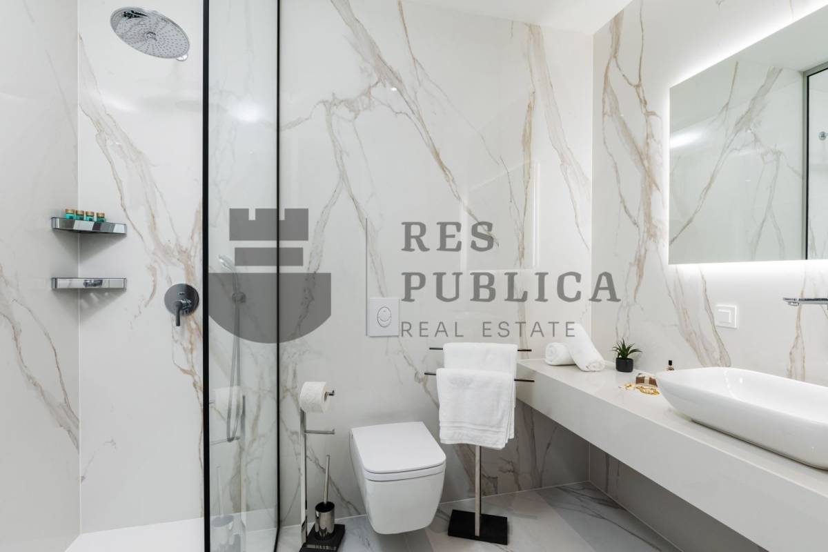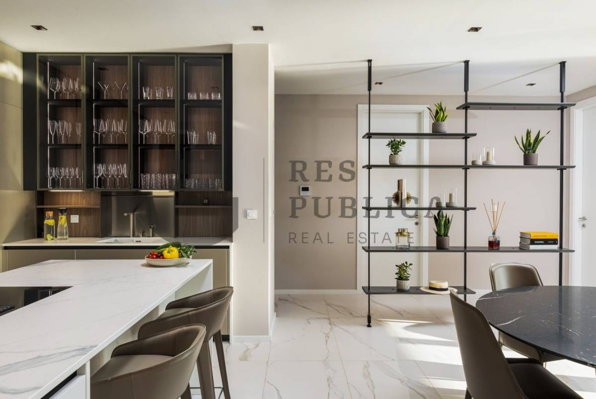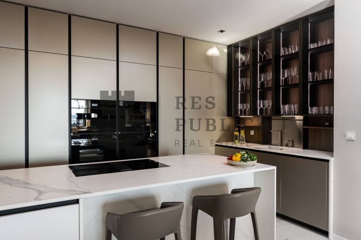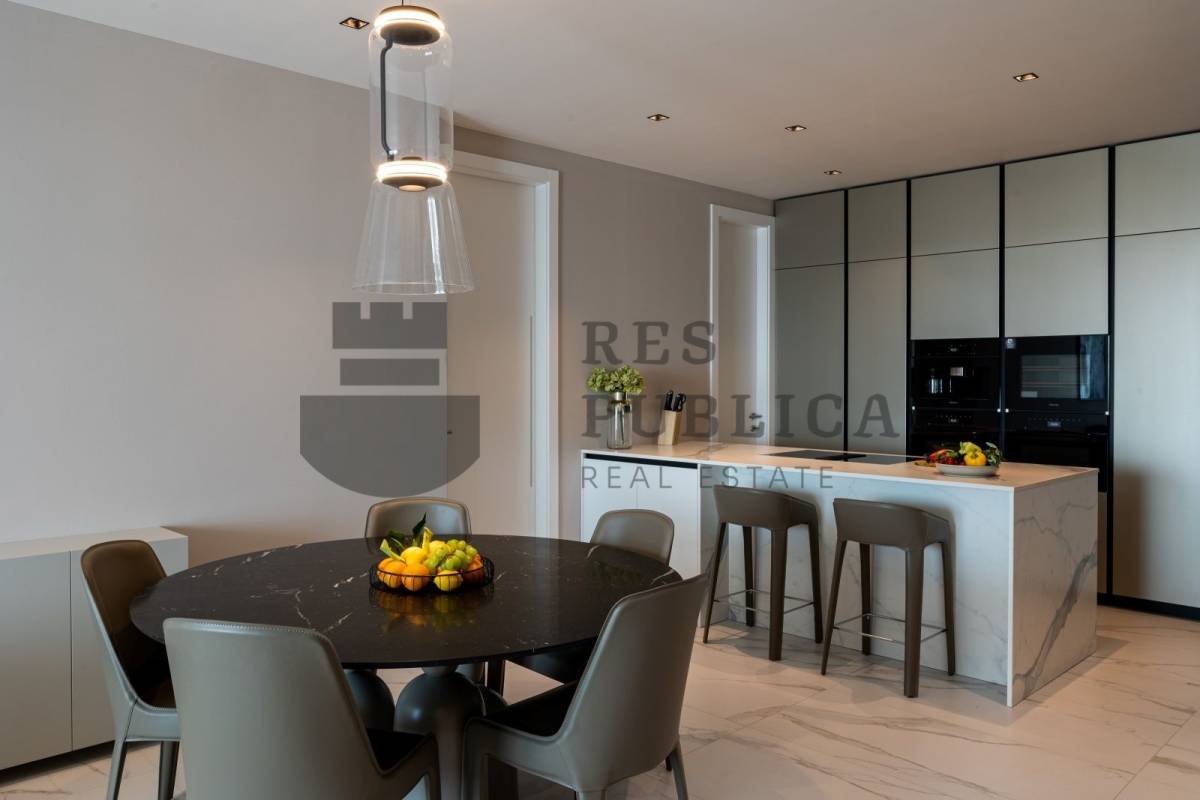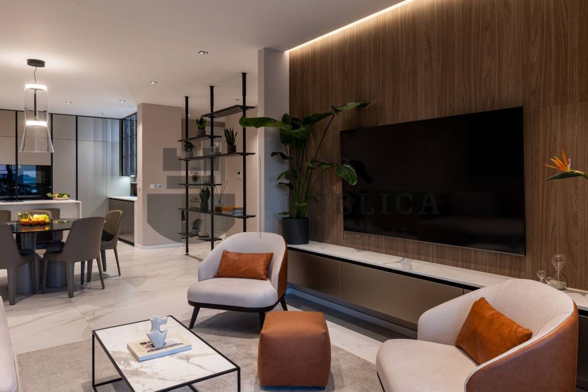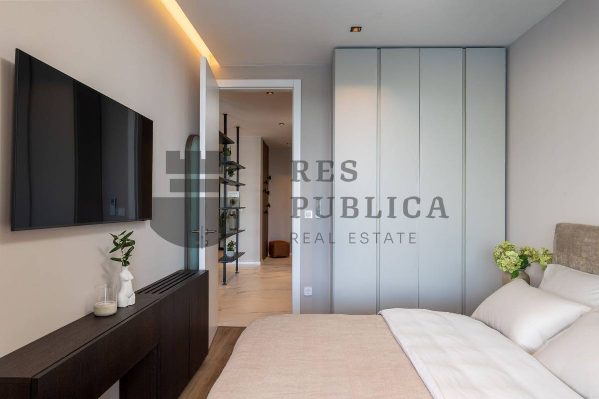 Stan je u potpunosti opremljen i prodaje se kao takav, spreman za useljenje. Njegova pažljivo osmišljena unutrašnjost uključuje tri prostrane sobe, dvije elegantno uređene kupaonice i otvoreni koncept dnevnog boravka koji se savršeno povezuje s blagovaonicom i kuhinjom. Svaki detalj uređenja naglašava osjećaj modernog, prozračnog i ugodnog doma.