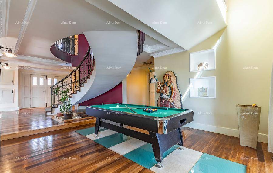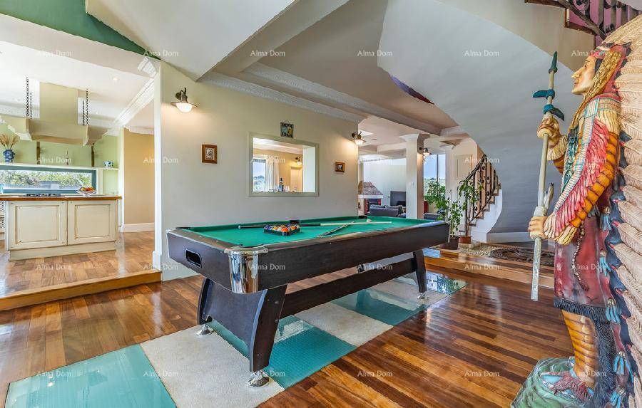 U prizemlju ville nalazi se prostran dnevni boravak sa biljarom i stolnim tenisom, kuhinja, ured, jedno kupatilo i stepenište koje vodi na kat.