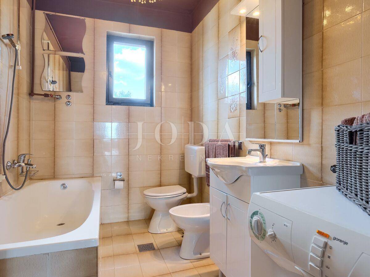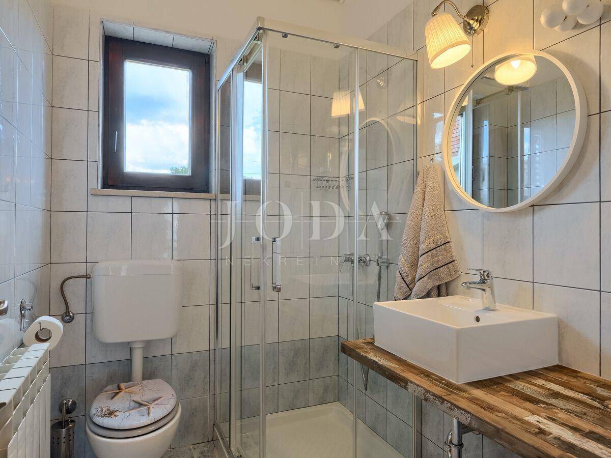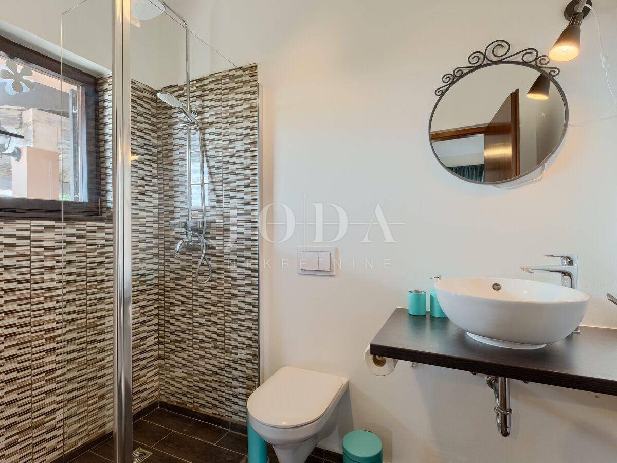 Kuća je kompletno namješena i opremljena, grijanje je centralno na pelete i klima uređajem na svakom katu.