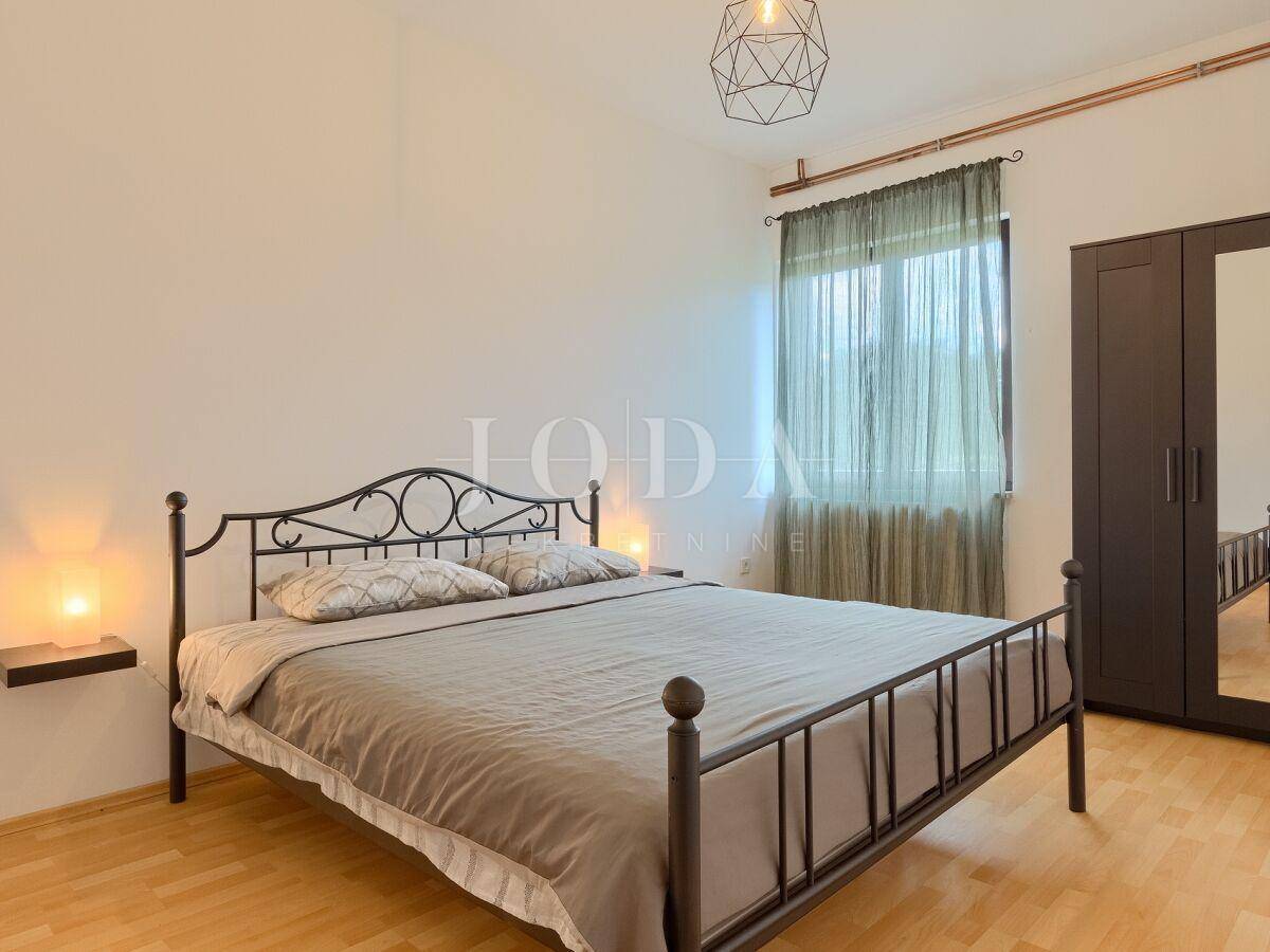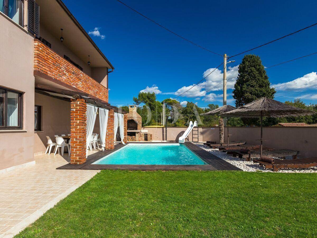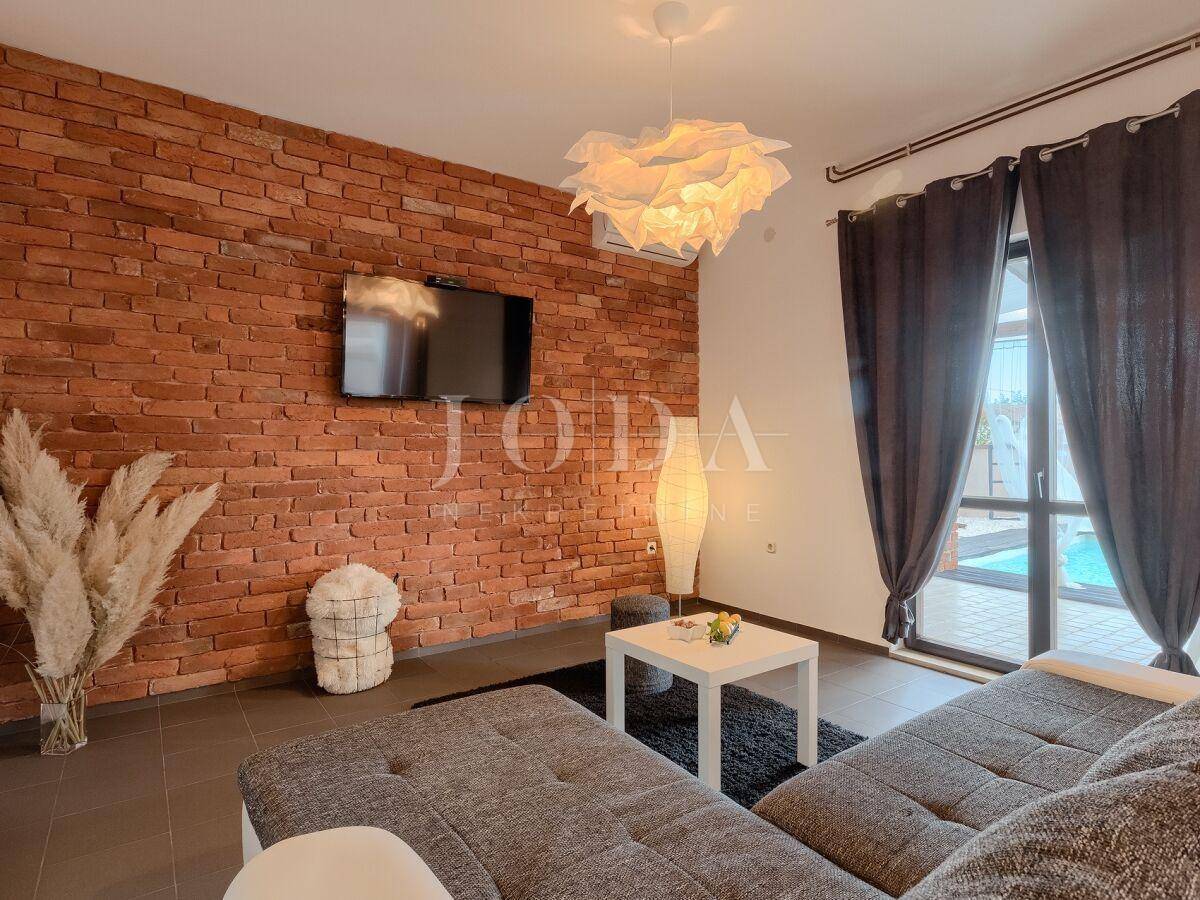 Kuća je kompletno namješena i opremljena, grijanje je centralno na pelete i klima uređajem na svakom katu.