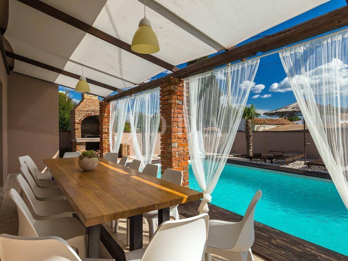 Na uređenoj i potpuno ograđenoj okućnici smjestio se bazen sa sunčalištem.