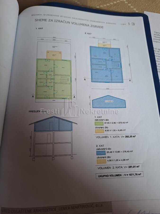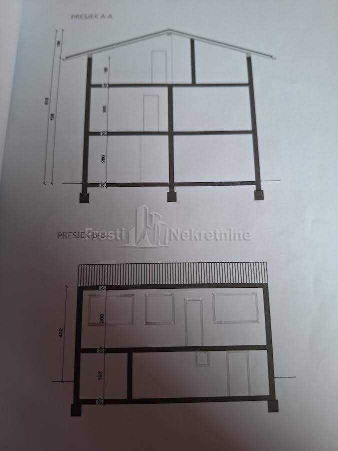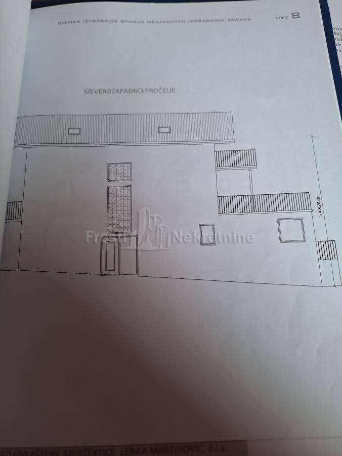 Visina kuće- 8,7 m; širina 9x18,5 m. Uz nekretninu je i garaža visine 2,6 m te širine 5,5x7 m.