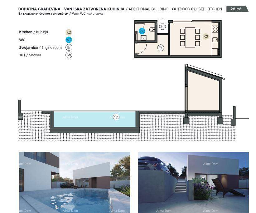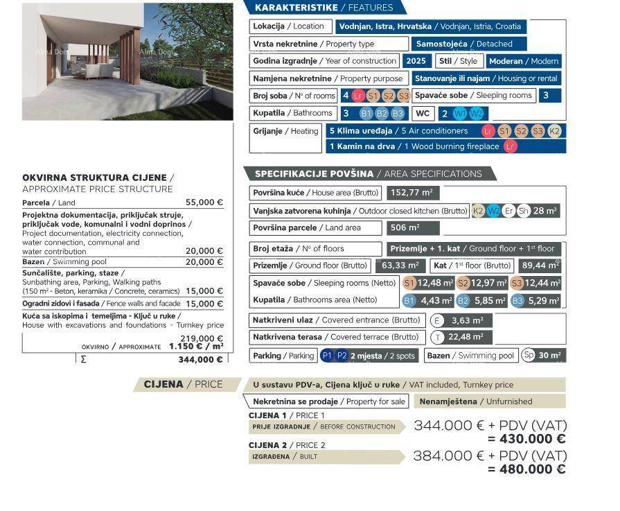 Građevinska dozvola je izdata za projekt montažne kuće na kat od 185m2 bruto zatvorene površine, neto 152 m2, s pomoćnim objektom od 28 m2 i bazenom od 24 m2