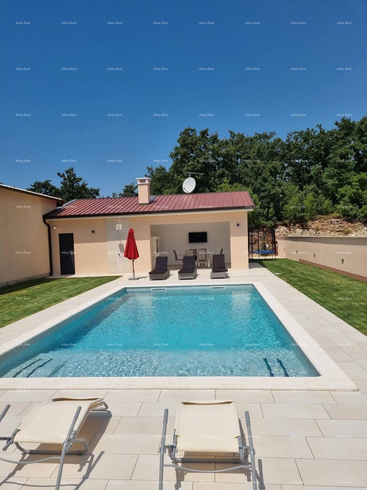 Na velikoj okućnici bazen od 40 m sa prekrasnom ljetnom kuhinjom i dodatnim toaletom, kuhinja natkrivena.