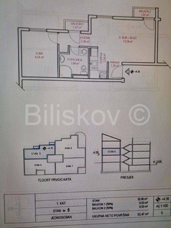 Jednosoban stan površine 32,4 m2 plus dva balkona, svaki obračunske povšine 1,07 i parking mjesto od 11,48 m2 u unutarnjoj garaži