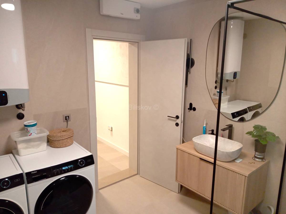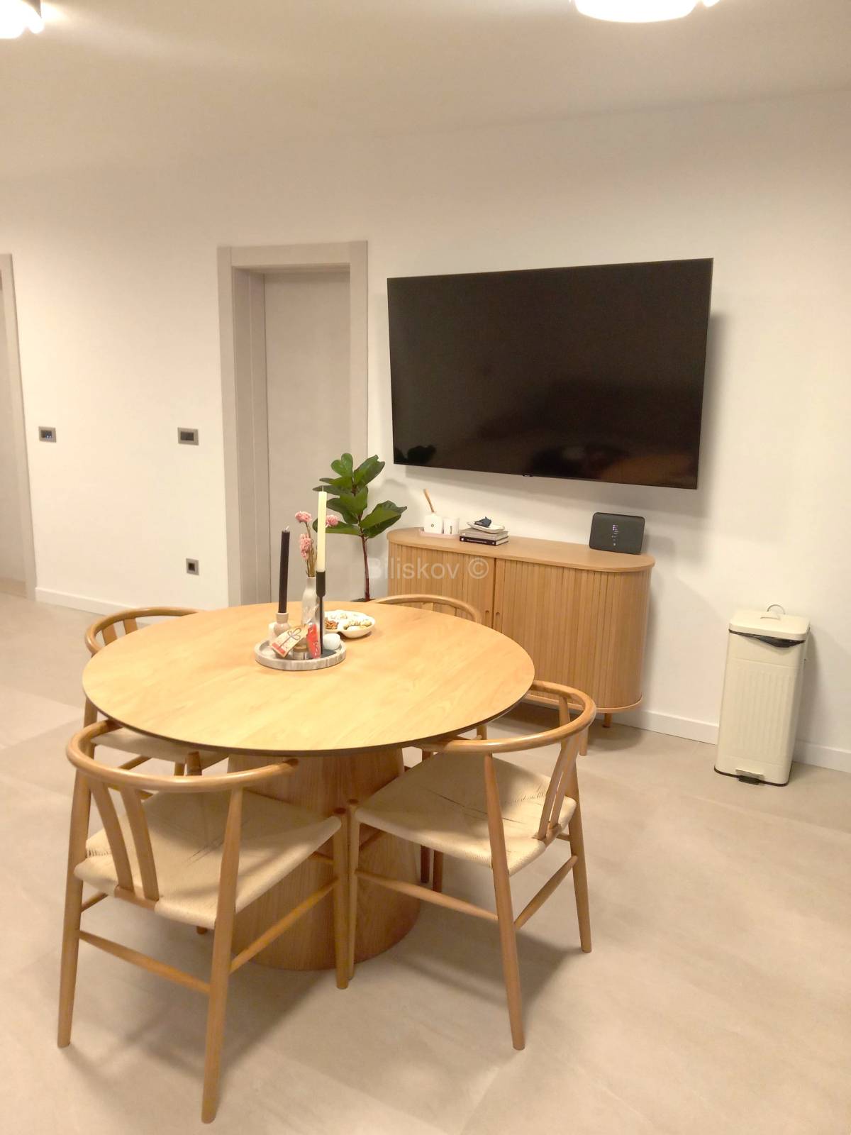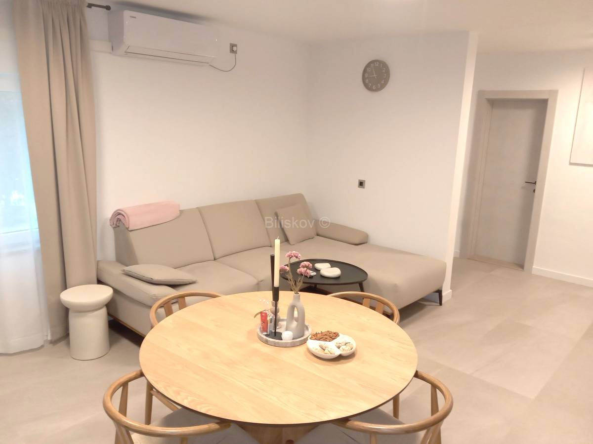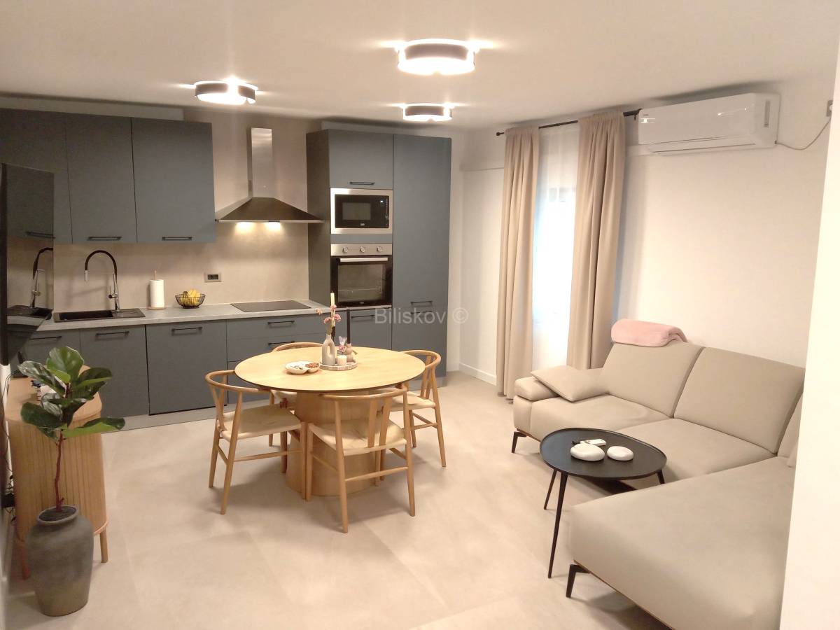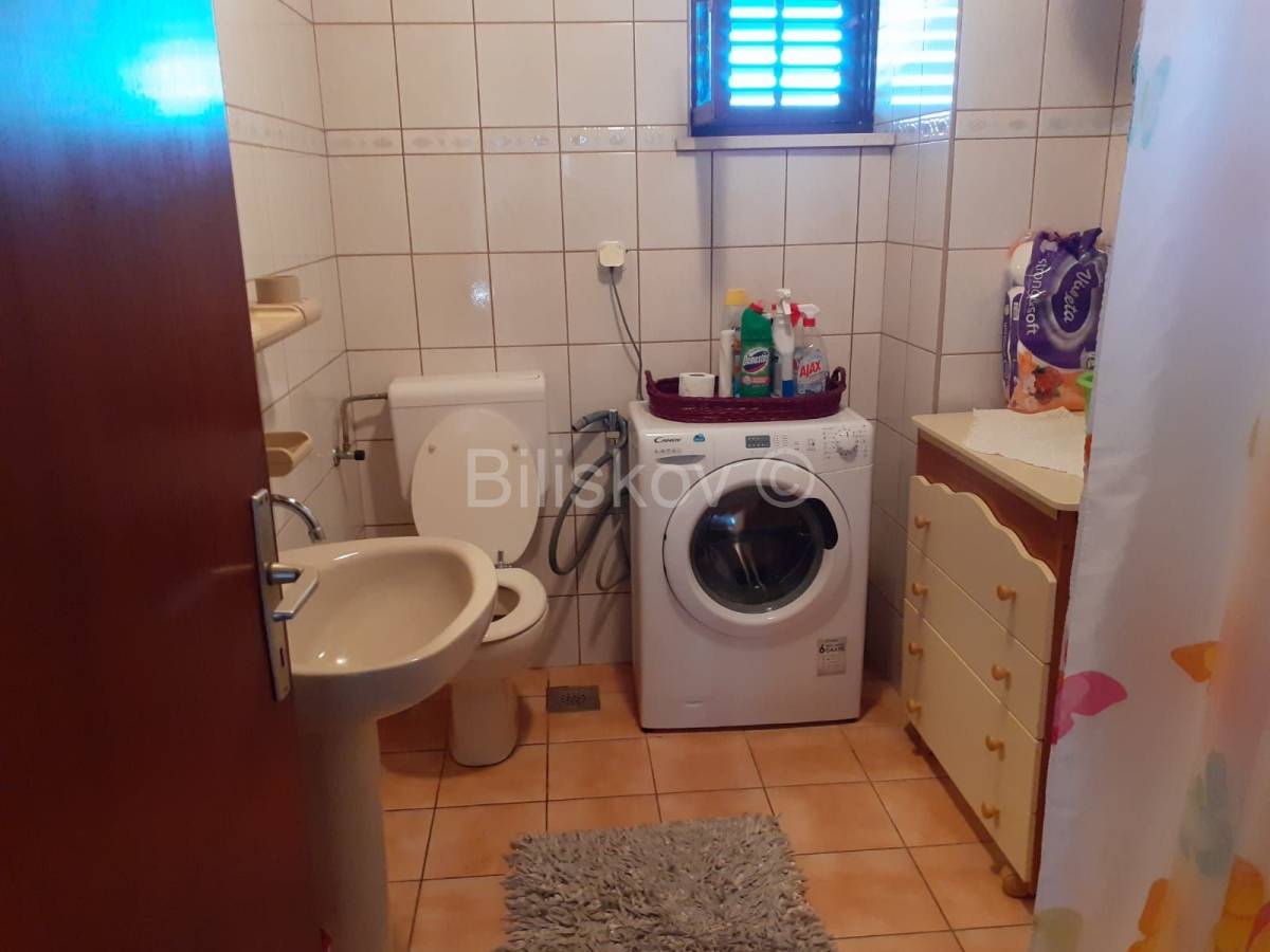 U prizemlju se nalazi stan koji je kompletno renoviran a sastoji se od velikog dnevnog boravka u sklopu kuhinje i blagovaone (otvoreni koncept), dvije veće spavaće sobe, WC-a, spreme i hodnika.