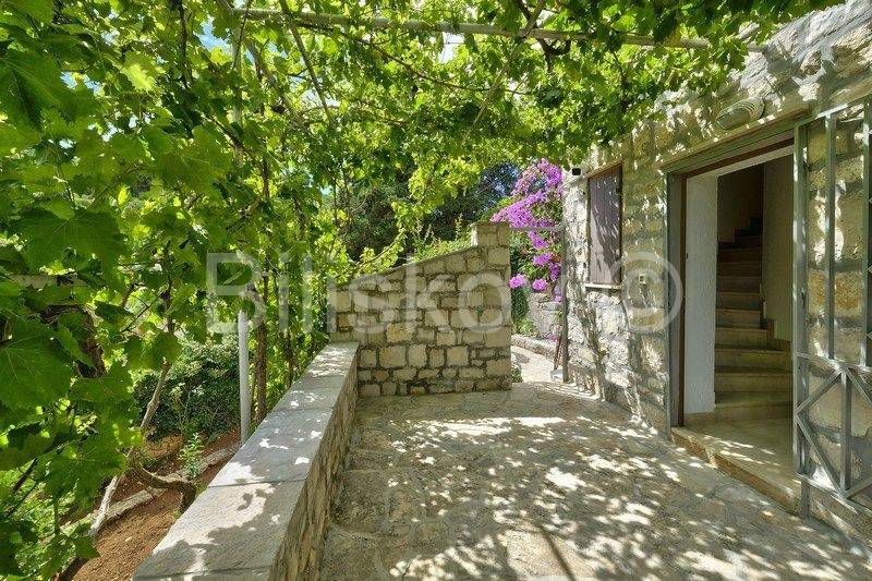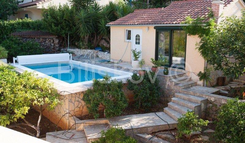 Brač, Splitska, 2 samostojeće kuće i bazen na kultiviranoj okućnici od 1000 m2 u centralnom dijelu mjesta, sa pogledom na more.