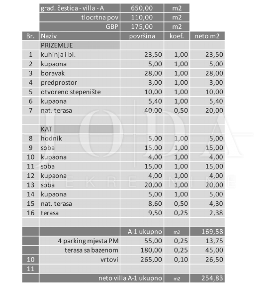 Prizemlje se sastoji će se od kupaonice, kuhinje i blagovaone te dnevnoga boravka, spremišta i stepeništa za na kat.Blagavainica i dnevni boravak su povezani sa vanjskom natkrivenom terasom koja se nastavlja prema sunčalištu i bazenu.