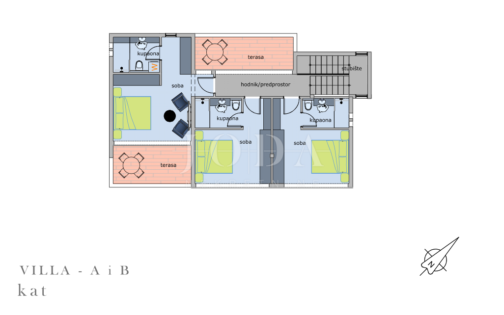 Na katu su tri spavaće sobe svaka sa vlastitom kupaonicom.