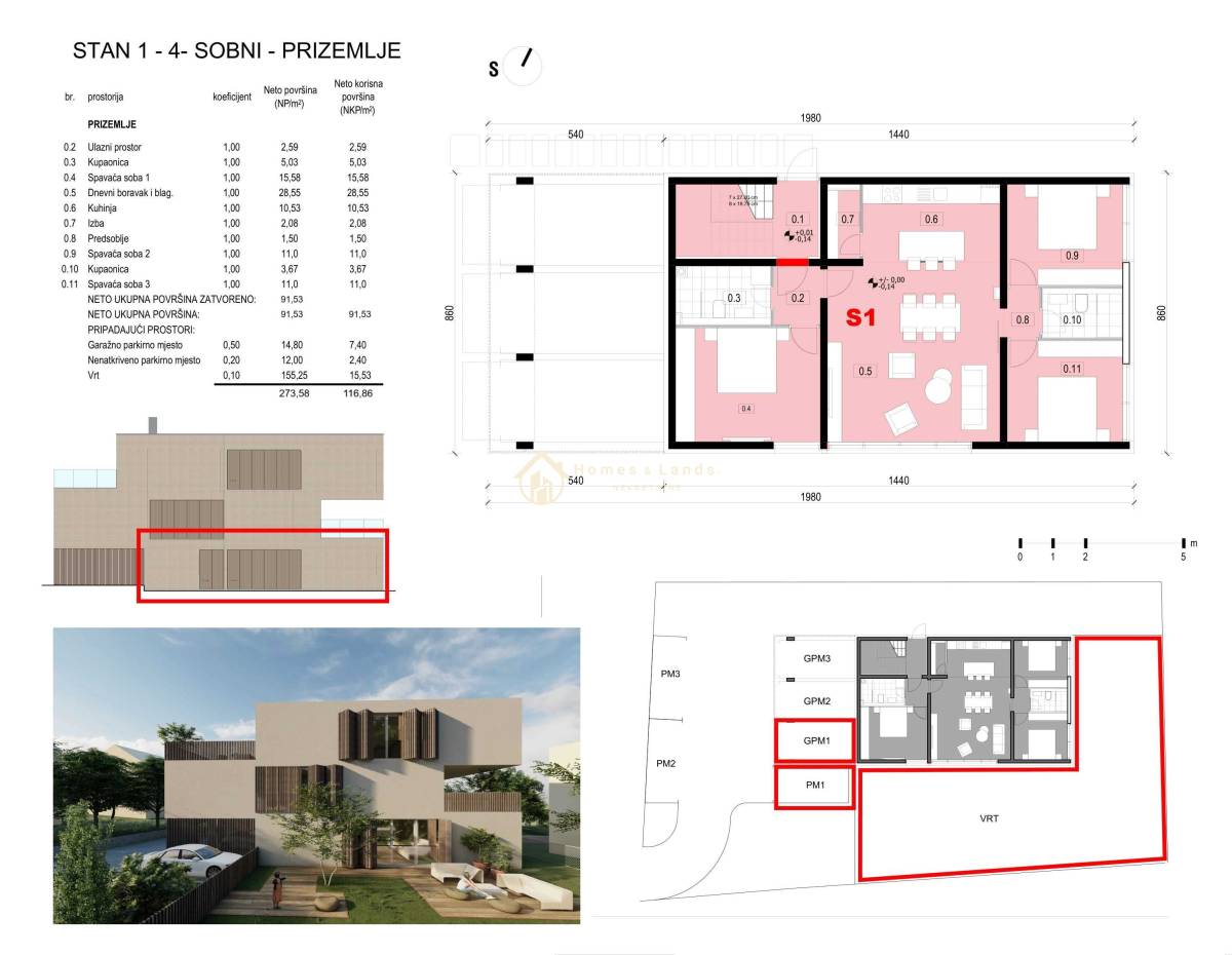 Stan S1 u prizemlju prostire se na ukupnoj korisnoj površini od 273 m² (obračunski 116,36m²). Sastoji se od prostranog ulaznog hodnika, kuhinje s blagovaonicom, dnevnog boravka, velike loggie, natkrivene prostrane terase, tri spavaće sobe, 2 kupaonice,izbe,garderobe,velikog vrta od 156m2 , garaže te vanjskog parkirnog mjesta.