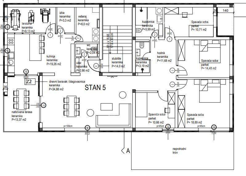 Četverosoban stan S5 se nalazi na 2.katu zgrade od ukupno 5 stanova, jedini je na katu, ima stambenu površinu od 166.04 m2 i sastoji od slijedećih prostorija: