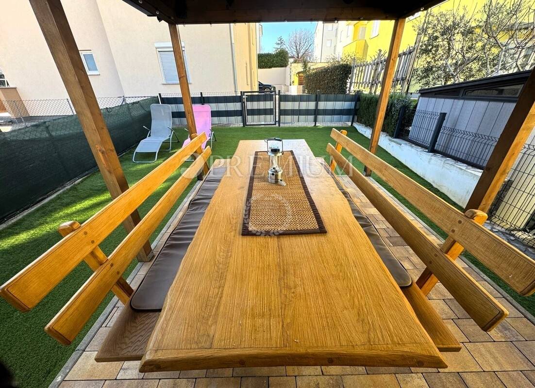 Uređena okućnica osigurava privatnost i prostor za boravak na otvorenom, a na njoj se nalazi i vrtna kućica koja služi kao spremište.