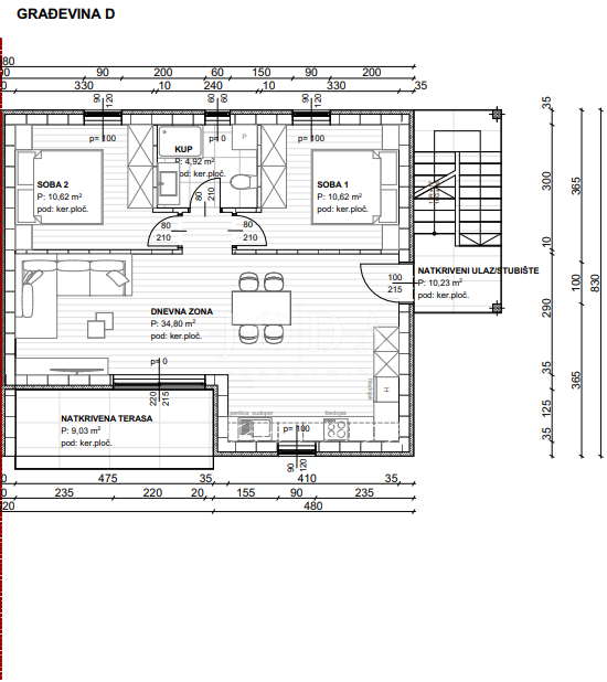 Stan se prostire na 80,84 m². Unutrašnjost stana sadrži dvije spavaće sobe od 10,62 m2 svaka, dnevnog boravka površine od 34,80 m², kupaonice (4,92 m²) te terasom i natkrivenim ulazom.