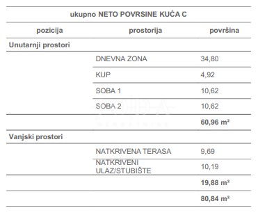 Stan se prostire na 80,84 m². Unutrašnjost stana sadrži dvije spavaće sobe od 10,62 m2 svaka, dnevnog boravka površine od 34,80 m², kupaonice (4,92 m²) te terasom i natkrivenim ulazom.