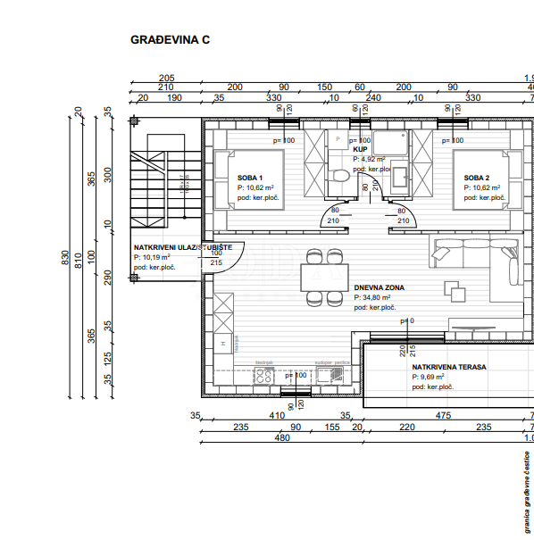 Zgrada je u fazi novogradnje, a završetak radova planiran je početkom ljeta 2025. godine. Riječ je o zgradi s tri stana, a svaki stan ima svoj zaseban ulaz putem vanjskog stubišta, što omogućava osjećaj privatnosti i udobnosti.
