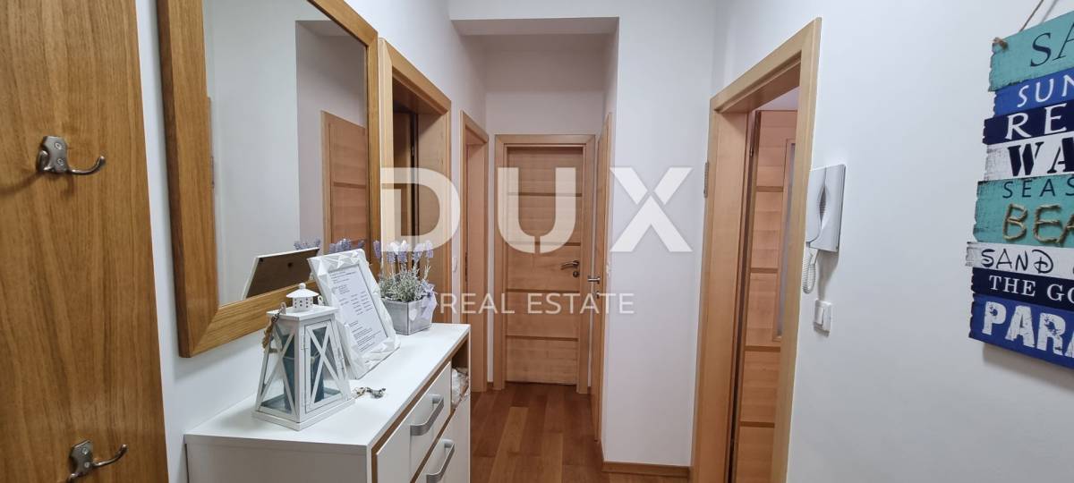 Predstavljamo vam stan koji spaja vrhunsku kvalitetu, atraktivnu lokaciju i izuzetan potencijal za život ili ulaganje. Smješten na prvom katu, ovaj stan površine 58 m² obuhvaća dvije komforne spavaće sobe, prostrani dnevni boravak, elegantnu kuhinju s blagovaonicom, modernu kupaonicu i praktičnu praonicu. Posebnu čar pruža balkon s pogledom na more, savršeno mjesto za opuštanje uz čašu vina ili uživanje u zalascima sunca. Uz stan dolazi i vlastito parkirno mjesto, što osigurava dodatnu pogodnost za vlasnike i goste.
