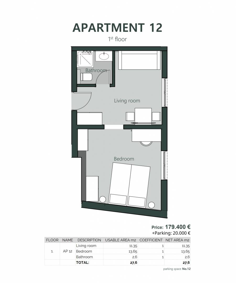 Apartman AP12 sastoji se od jedne spavaće sobe, prostranijeg dnevnog boravka koji se vrlo jednostavno može organizirati kao dodatna soba, kupaonice te ima ukupnu neto površinu od 27,6 m2. Zahvaljujući većoj kvadraturi i pravilnom rasporedu, ovaj apartman pruža osjećaj ugodnog boravka koji nadilazi klasični hotelski standard, uz zadržanu funkcionalnost i investicijsku učinkovitost.
