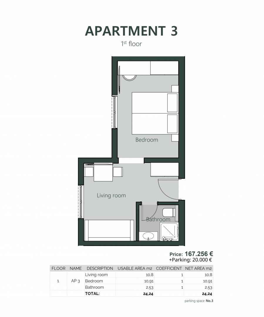 Apartman AP3 sastoji se od jedne spavaće sobe, dnevnog boravka koji se po potrebi može organizirati kao dodatna soba, kupaonice te ima ukupnu neto površinu od 24,24 m2. Koncipiran je kao učinkovit i tržišno vrlo tražen hotelski apartman, idealan za turistički najam, ali i za osobno korištenje tijekom cijele godine.