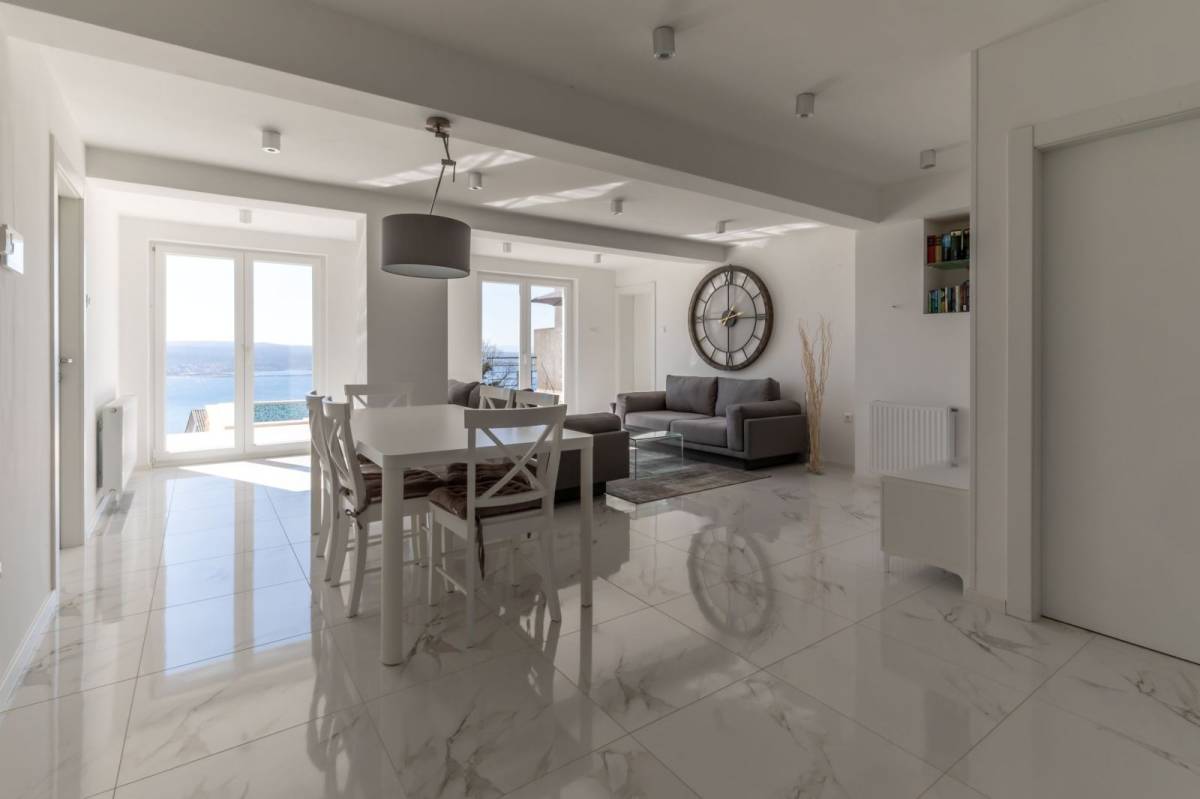 Pogled na more nije ograničen na više etaže, prisutan je i iz prizemlja, a iz grijanog bazena otvara se prema otoku Krku. Bazen koristi sustav elektrolize soli, bez klora, što gosti osjete kod boravaka duljih od nekoliko dana. Upravo takvi detalji često odlučuju hoće li se gost vratiti sljedeće sezone.
