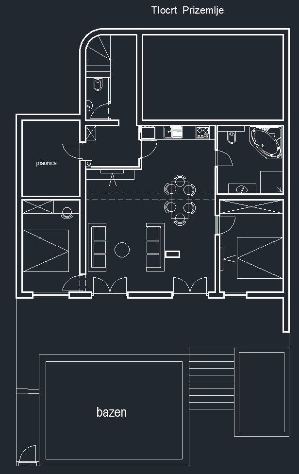 Okućnica je kaskadno uređena, s jasno definiranim zonama za boravak, roštilj i odmor. Garaža i dodatnih šest parkirnih mjesta rješavaju situaciju koja u praksi često stvara problem kod gostiju, posebno u vrhuncu sezone kada je javni prostor ograničen. Priključak na gradsku kanalizaciju izveden je gravitacijski, što dugoročno znači manje tehničkih intervencija.