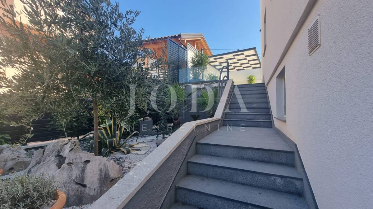 U dvorištu unutar kojega se ulazi pomičnim vratima je parking za više automobila te ulaz u prizemlje gdje je garaža i dio koji je uređen kao zaseban studio apartman ili prostor za druženje.