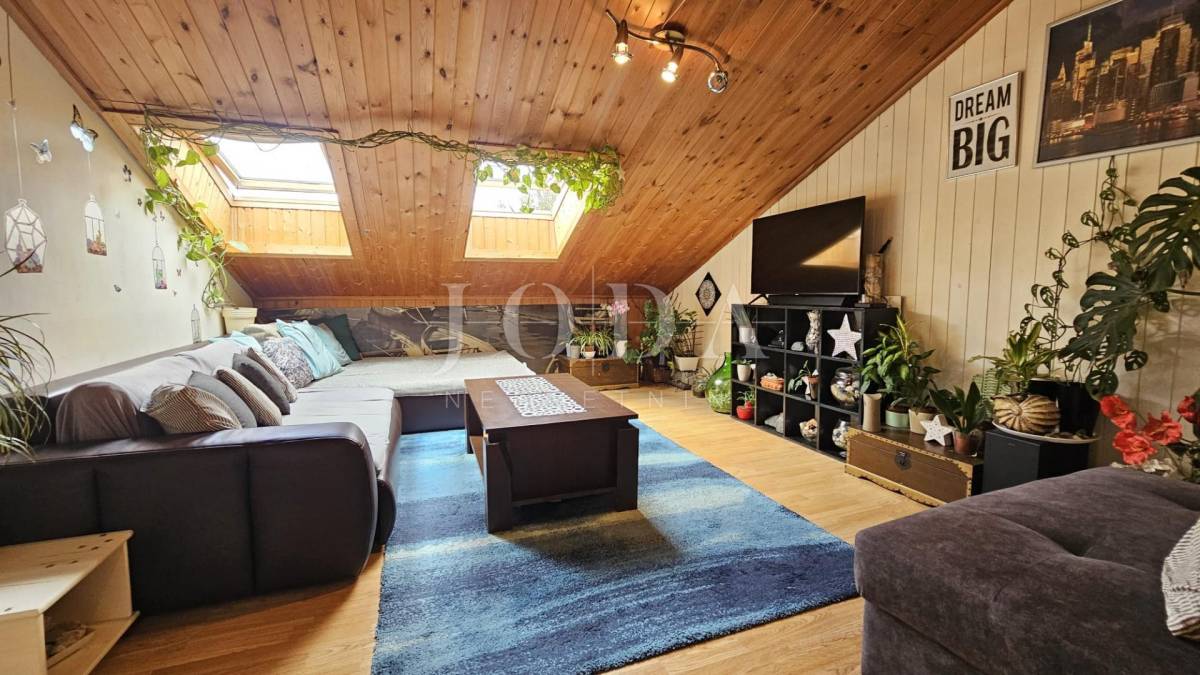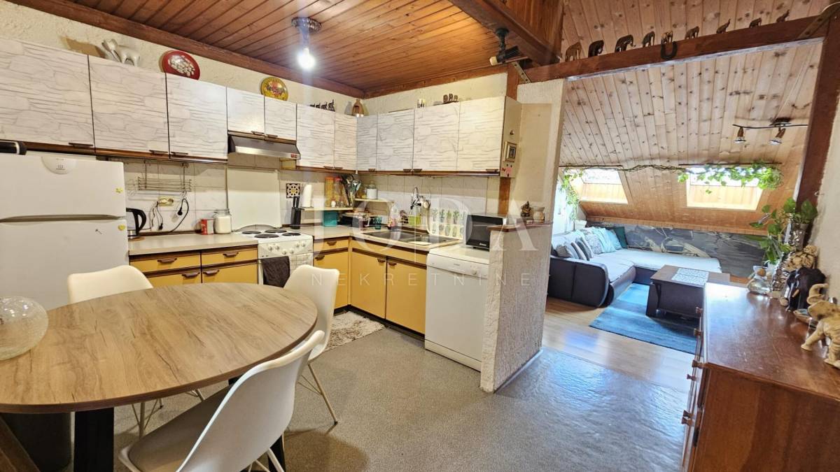 Druga etaža je potpuno uređen dvosobni stan sa dugačkim južnim balkonom,dok je u visokom potkovlju također useljivi dvosobni stan.