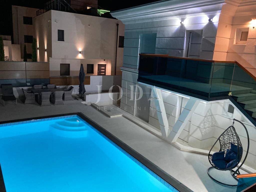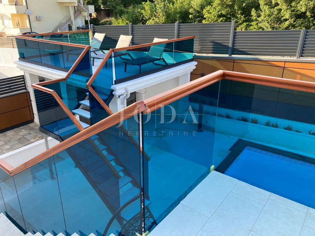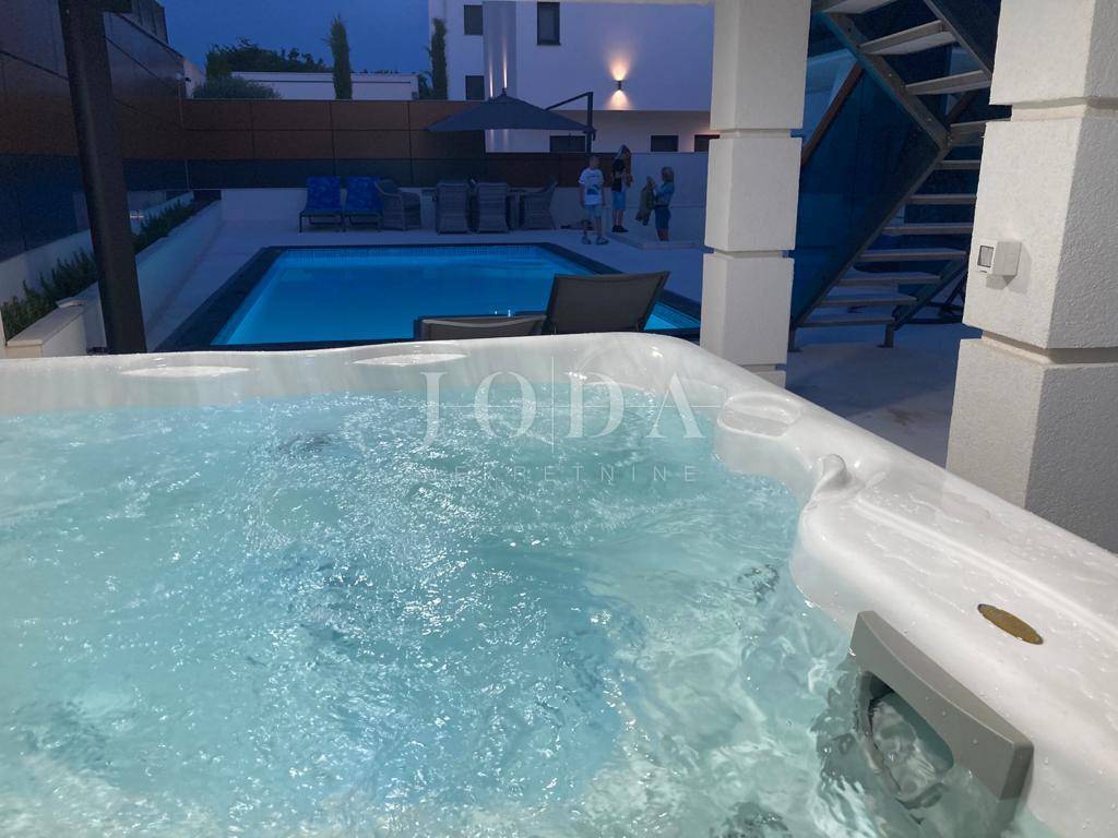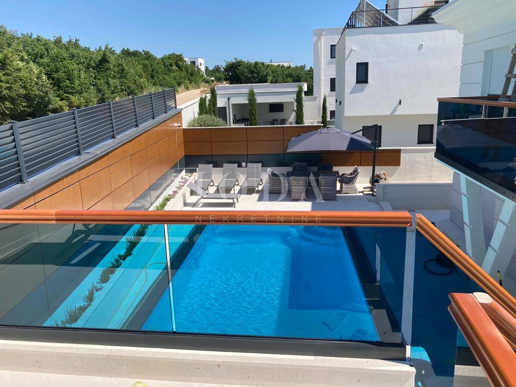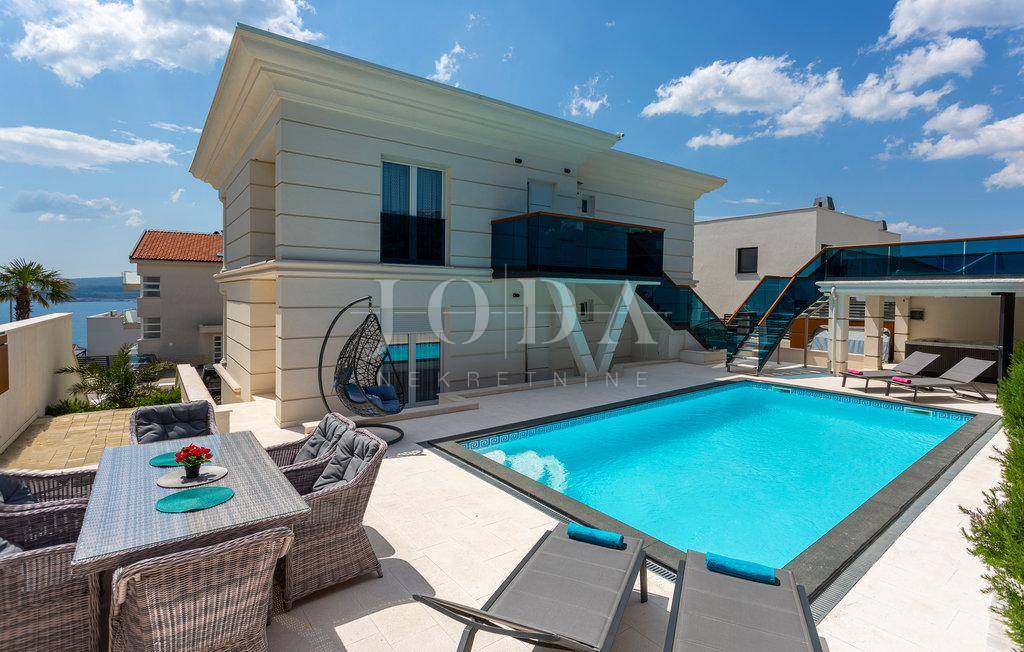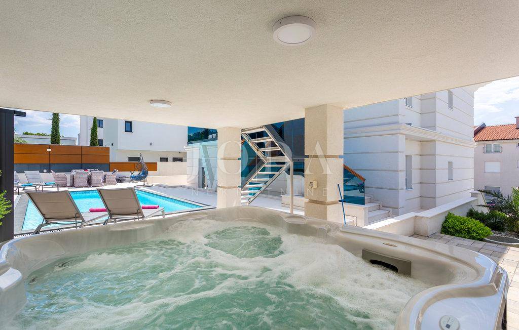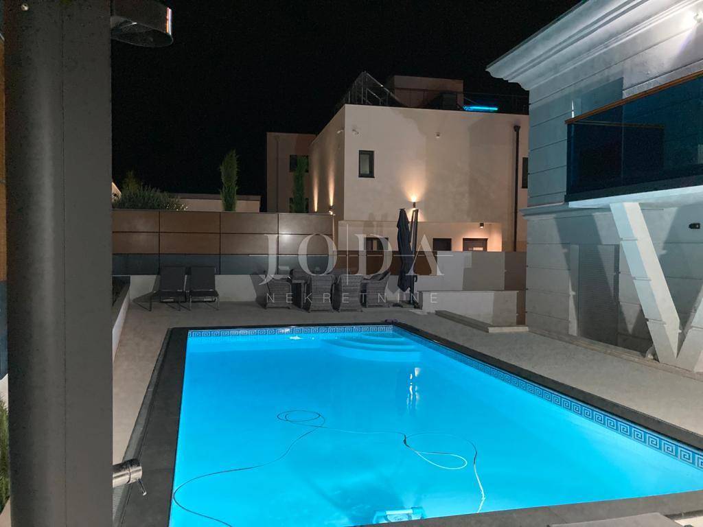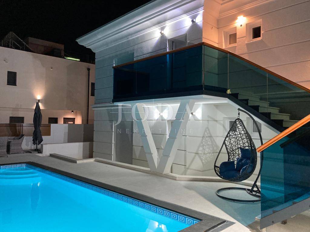 Sa stražnje strane kuće je smješten bazen,sunčalište te jacuzzi.Kuća je potpuno namještena i opremljena visokokvalitetnim materijalima i opremom te dizajniranim namještajem.