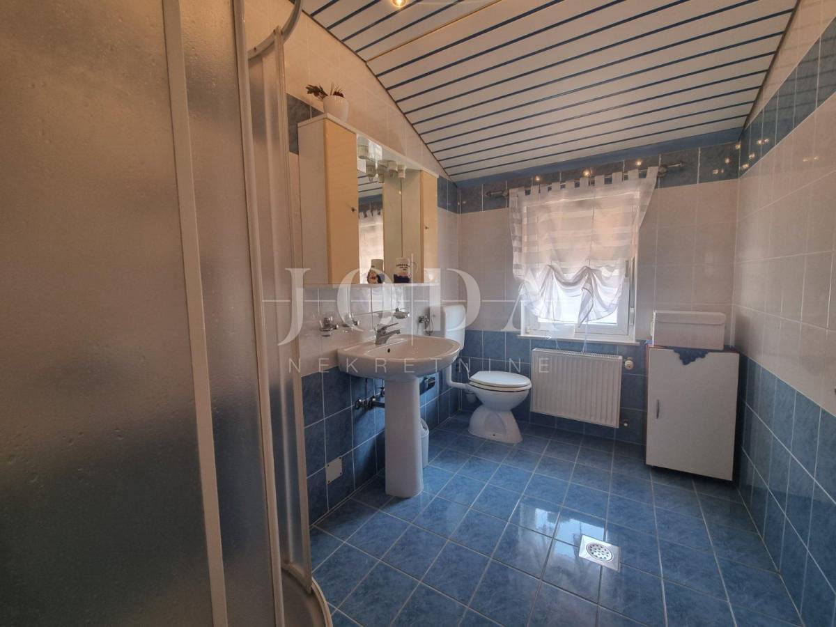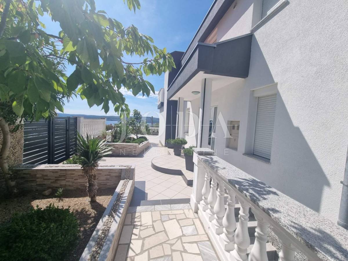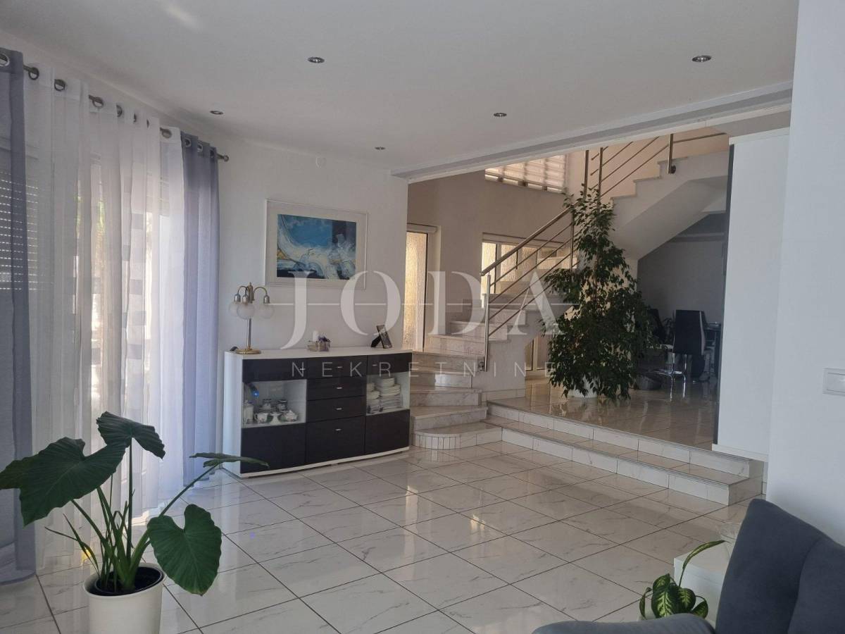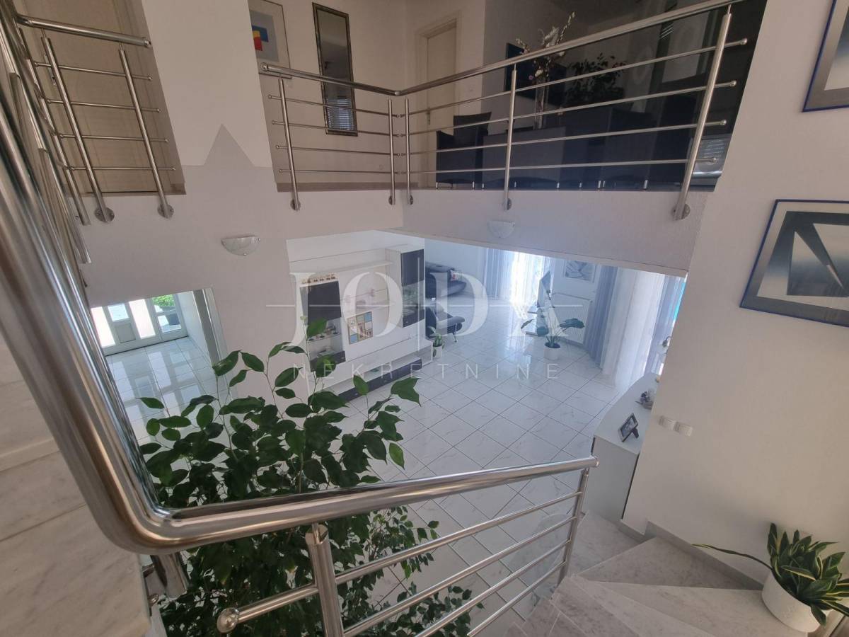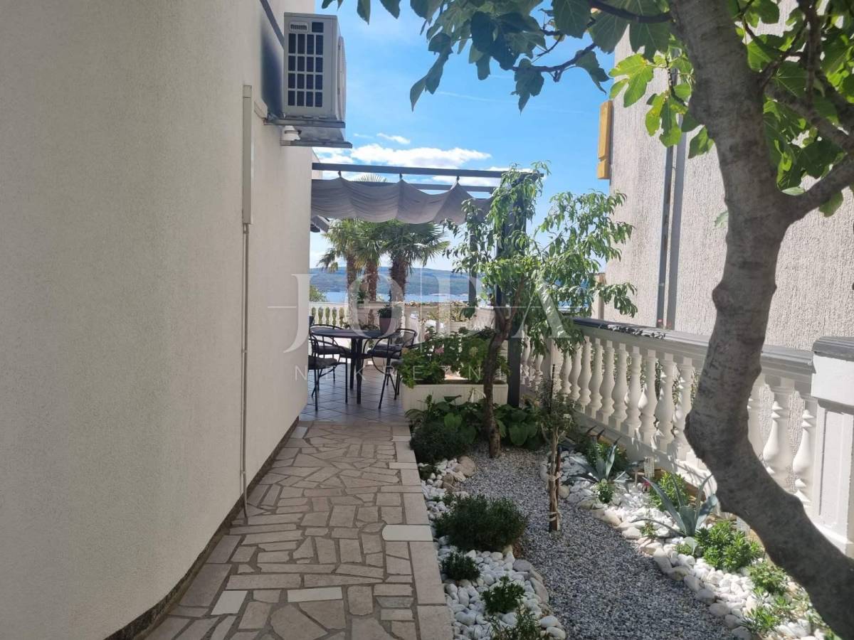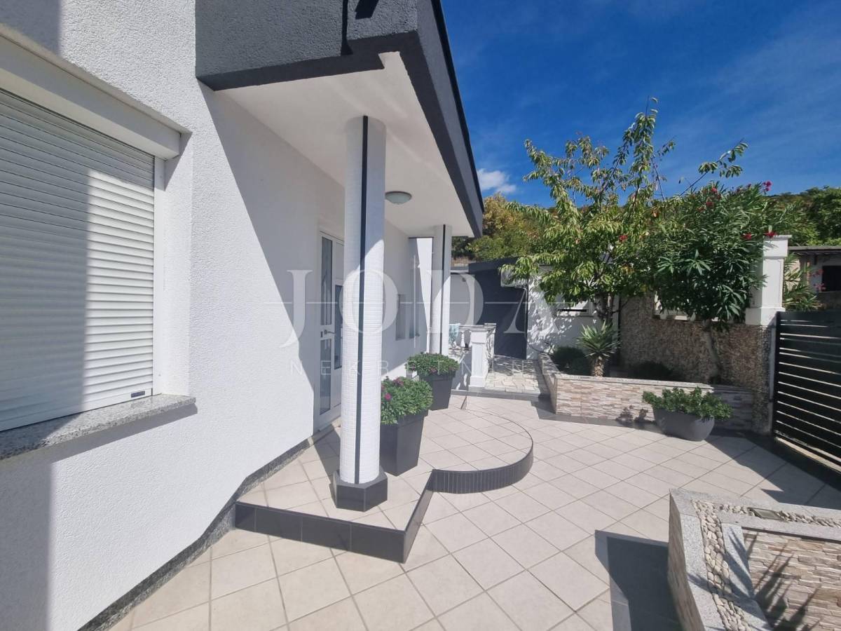 Prodajemo samostojeću kuću sa bazenom i lijepo uređenom okućnicom na parceli od 470m2. Kuća se sastoji od suterena, prizemlja i kata. Iza kuće nalazi se jedan jednosobni aprtman, kotlovnica i pušnica. U suterenu kuće nalaze se dvije garaže i studio apartman. Prizemlje se sastoji od jedne spavaće sobe, kupaone, ulaznog hodnika te prostranog otvorenog prostora (kuhinja, blagovaona i dnevni boravak). Unutranjim stepenicma ide se na kat gdje se nalaze dvije spavaće sobe sa dvije kupaone te prostrani hodnik.Jedna soba ima izlaz na balkon a druga na terasu sa koje se pruža panoramski pogled na more. Unutar okućnice osim bazena sa sunčalištem nalazi se prekrasni vrt sa bočnnom terasom i kaminom. Kuća za život ali i spremna za korištenje u turističke svrhe.