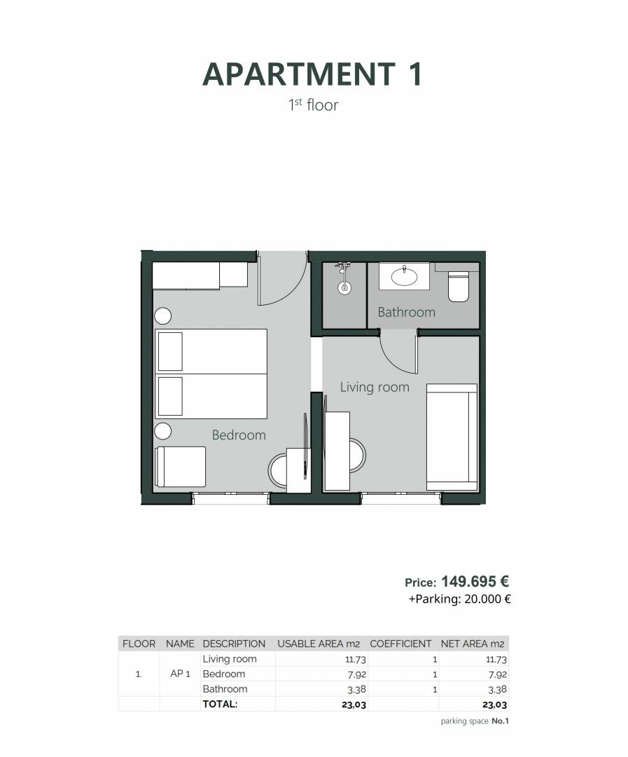 Apartman AP1 sastoji se od jedne spavaće sobe, dnevnog boravka koji se može jednostavno organizirati kao dodatna soba, kupaonice te ima ukupnu neto površinu od 23,03 m2. Riječ je o funkcionalno osmišljenom apartmanu hotelskog tipa koji se nalazi u potpuno renoviranom objektu u Crikvenici, razvijenom prema suvremenom konceptu individualnog vlasništva uz profesionalno hotelsko upravljanje.