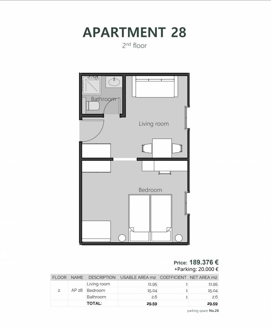 Apartman AP28 sastoji se od jedne sobe i kupaonice te ima ukupnu neto površinu od 28,59 m2, što ga čini najvećim apartmanom u objektu unutar ove kategorije. Smješten je u potpuno renoviranom objektu hotelskog tipa u Crikvenici i predstavlja iznimno funkcionalnu smještajnu jedinicu, pogodnu za osobno korištenje i turistički najam u okviru organiziranog hotelskog sustava.