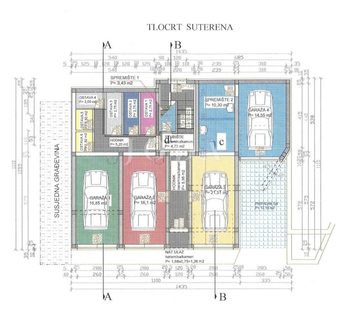 U suterenu su garaže i spremišta, od kojih su spremišta pripadak stanu kao i parkirno mjesto. Samo dvije garaže slobodne za zasebnu kupnju.