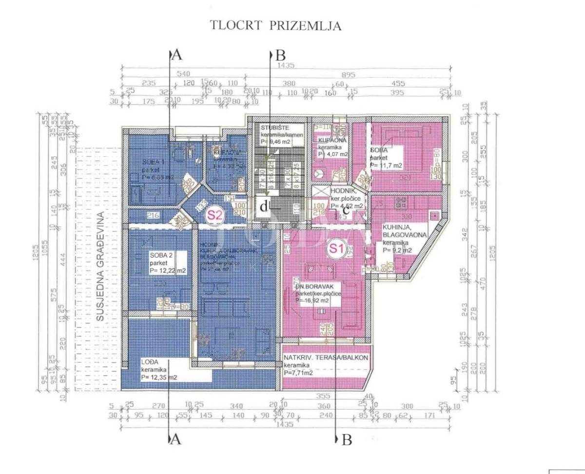 Na prizemlju (visina prvog kata) su po dva stana, oba sa po dvije spavaće sobe, kupaonicom te otvorenim konceptom dnevnog boravka i kuhinje sa izlazom na lijepu loggiu.