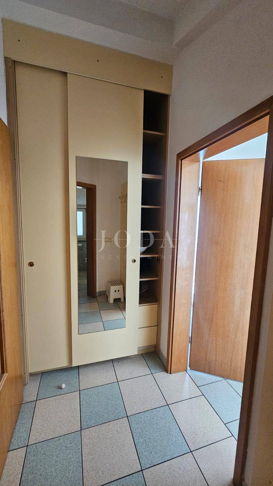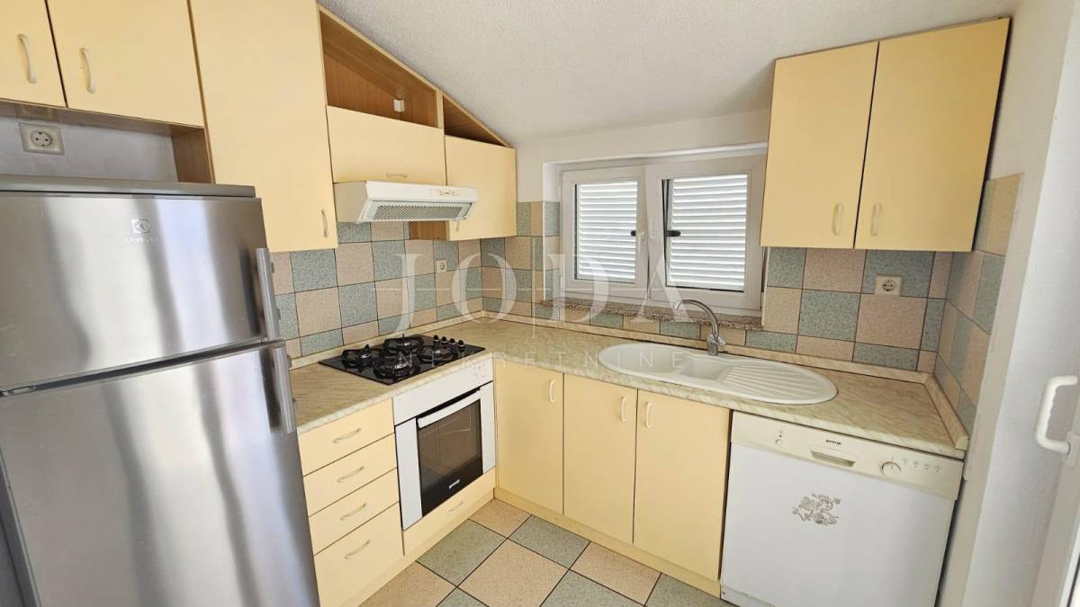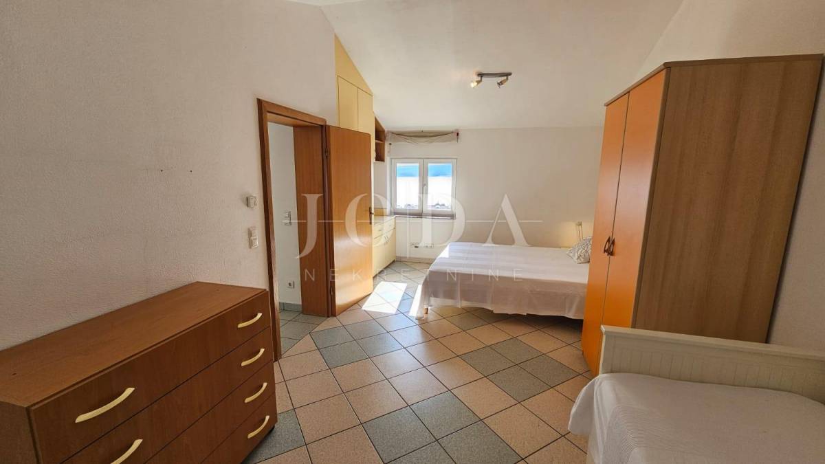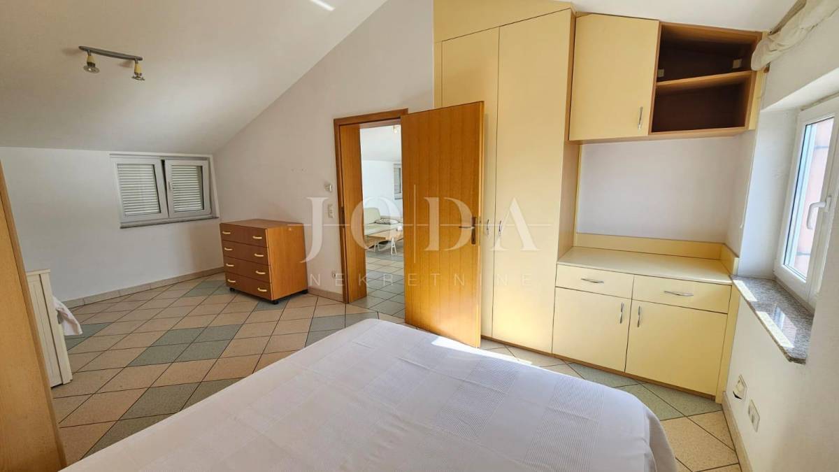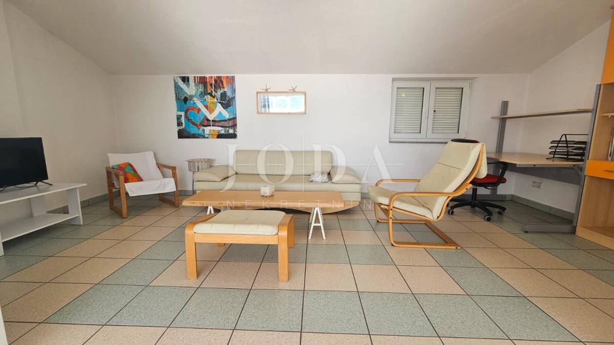 Stan se nalazi na 2. (zadnjem) katu kvalitetne zgrade iz 2002., s ukupno 6 stanova. Sastoji se od hodnika, kupaonice, open-space kuhinje s blagovaonicom i dnevnim boravkom koji izlaze na natkrivenu loggiu (15 m²), te velike spavaće sobe od 25 m².