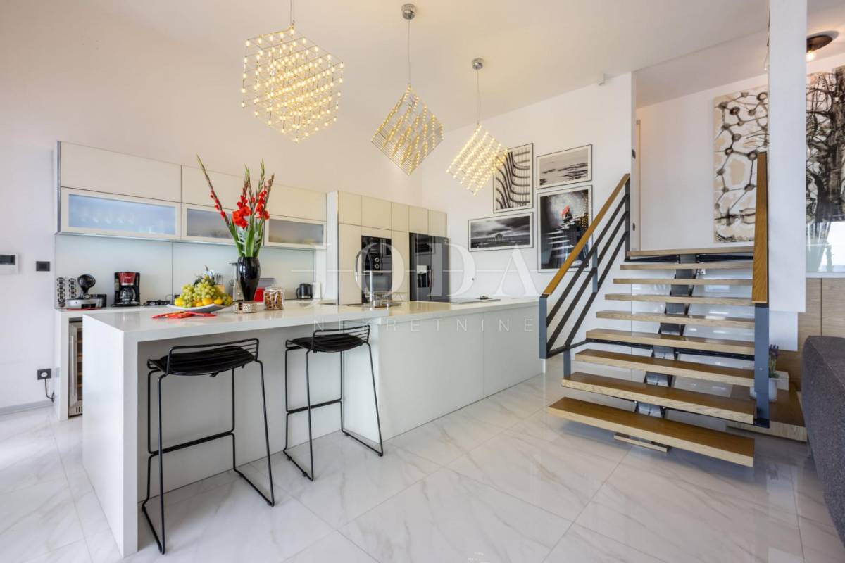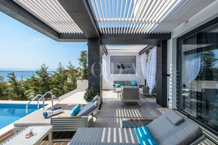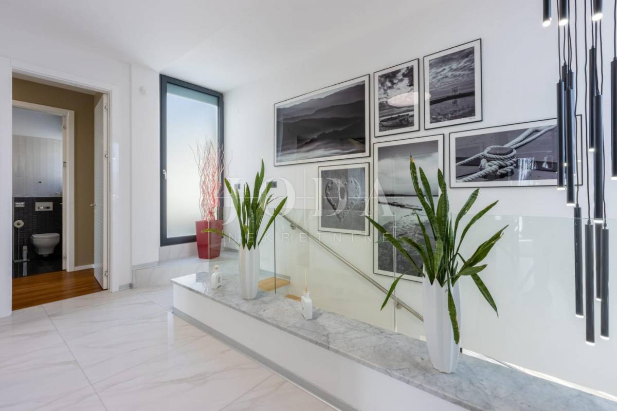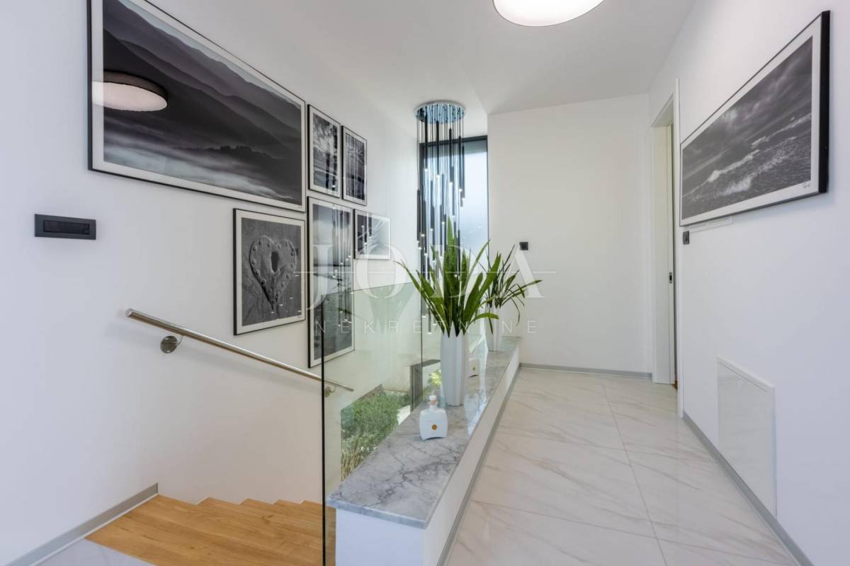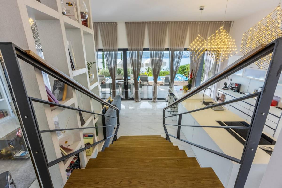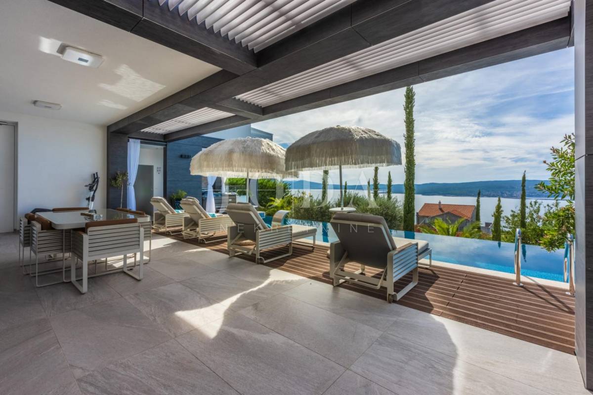 Četri spavaće sobe svaka sa vlastitom kupaonicom,kuhinja blagavaonica te dnevni boravak koji se stapaju sa vanjskim dijelom i čine cijelinu sa jednim od spektakularnijih pogleda u Crikvenici.