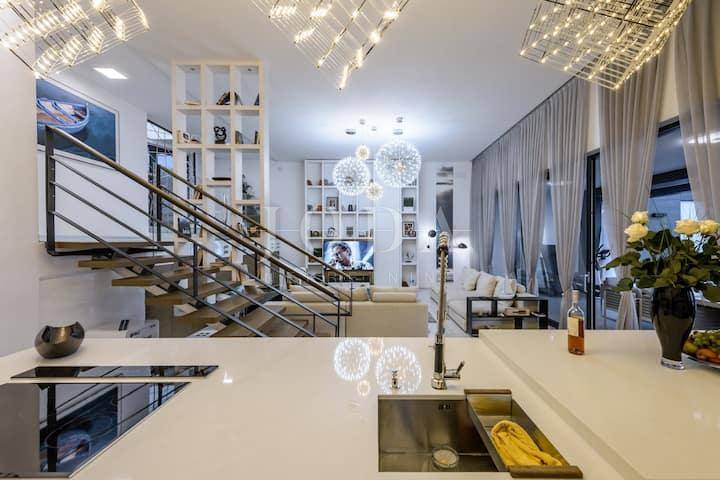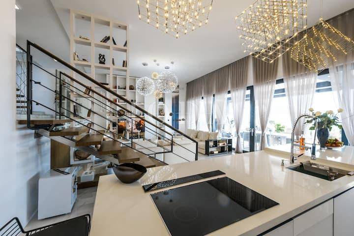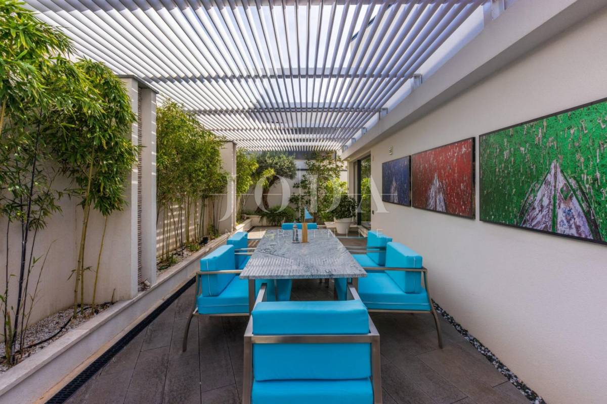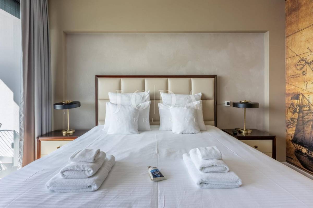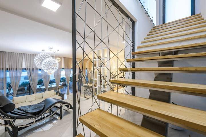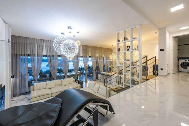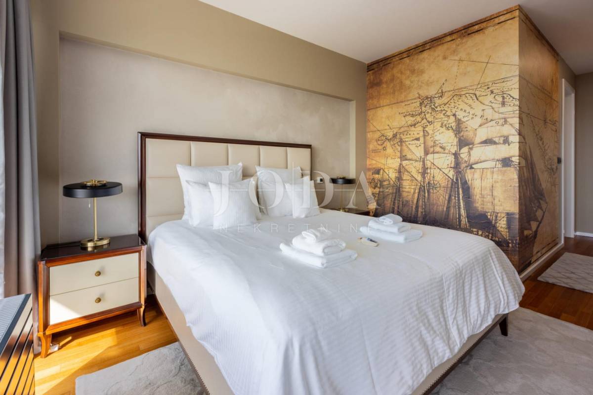 Četri spavaće sobe svaka sa vlastitom kupaonicom,kuhinja blagavaonica te dnevni boravak koji se stapaju sa vanjskim dijelom i čine cijelinu sa jednim od spektakularnijih pogleda u Crikvenici.